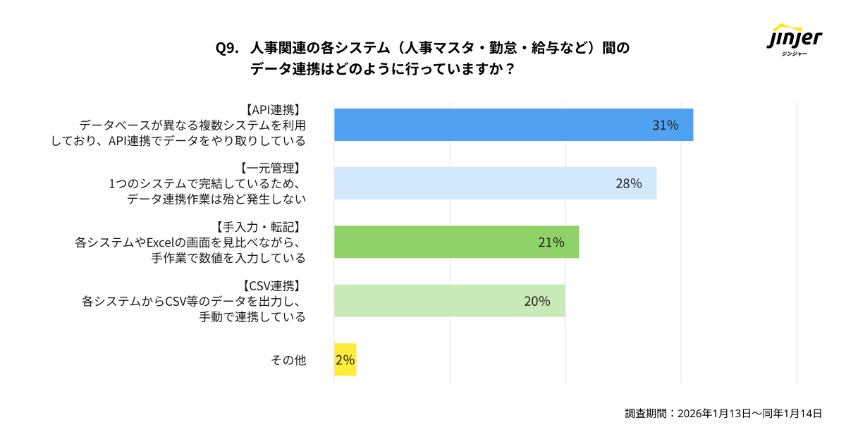 人事関連の各システム間のデータ連携に関して、41%の企業が「手入力」や「CSV連携」で対応している。より効率的な労務管理につながる「人事データの一元管理」ができている企業は、31%にとどまるという結果に
