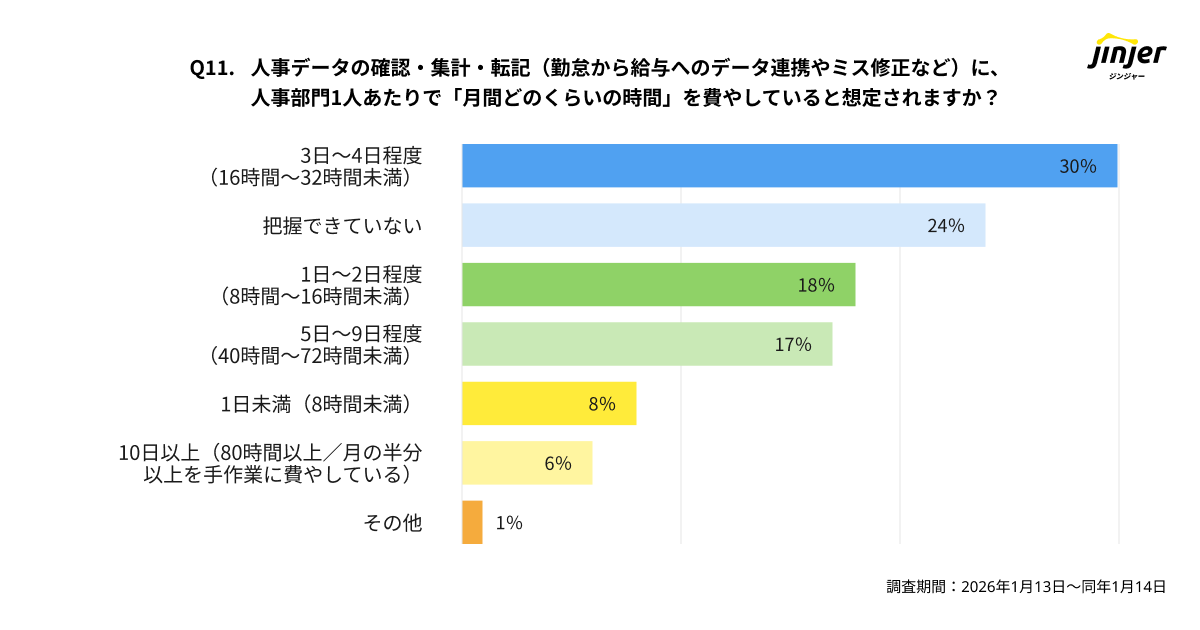 また、人事部門1人あたりのデータ確認・修正作業にかかる月間の時間は、「3〜4日程度(16時間〜32時間未満)」 との回答が最も多い結果となりました。