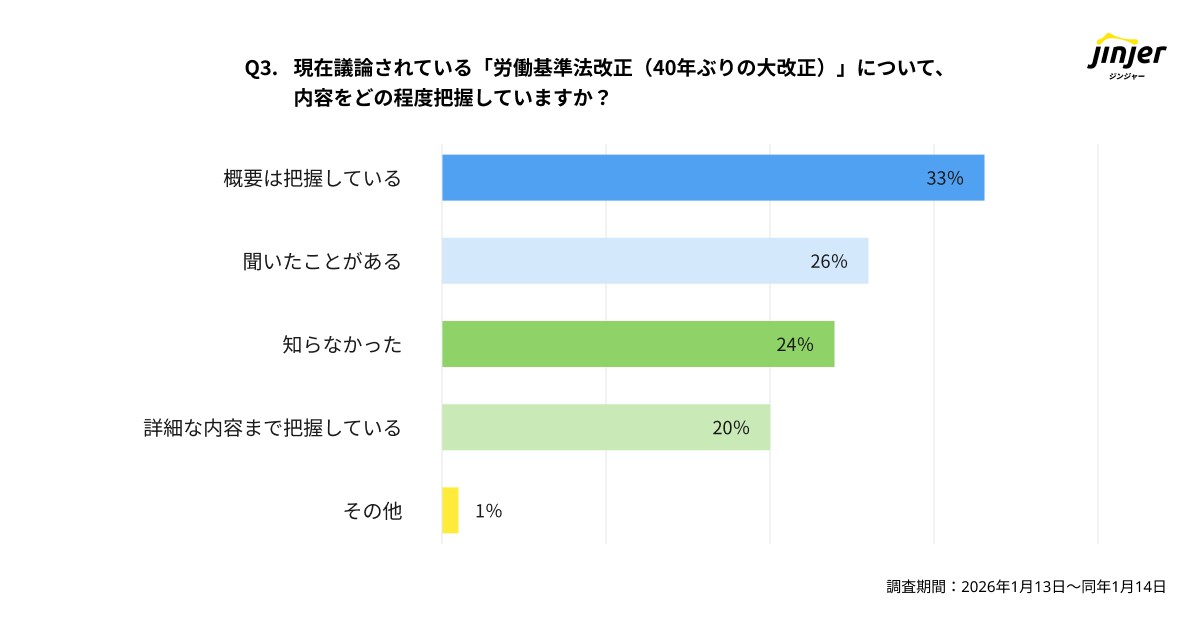 現在議論されている労基法改正の内容について、50%が「聞いたことがある」「知らなかった」と回答。詳細な内容まで把握しているのは20%にとどまる