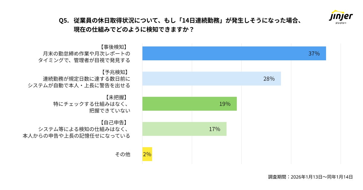「14日連続勤務」の禁止が検討されていますが、発生を事前に検知できる仕組み(予兆検知)を持つ企業は28%にとどまりました 。残りの73%は「月末の締め作業での事後検知(37%)」や「特にチェックする仕組みがない(19%)」、「自己申告・上長の記憶頼み(17%)」となっており、法違反を未然に防ぐ体制が不十分であることが明らかになりました。