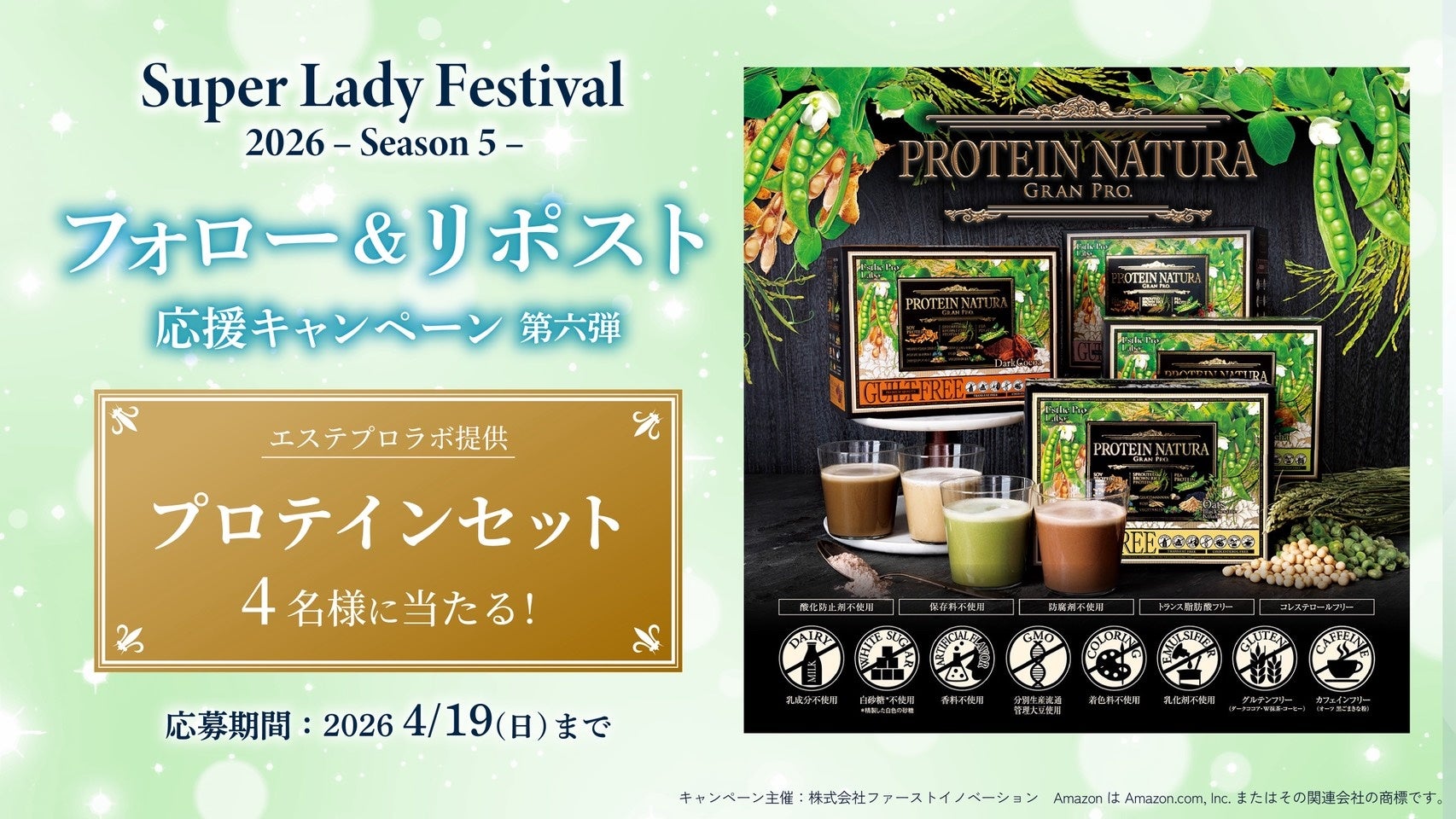 エステプロラボ提供でプロテインセットが当たる。応援スポンサー連携で「Super Lady Festival 2026-Season5-」来場促進を応援!