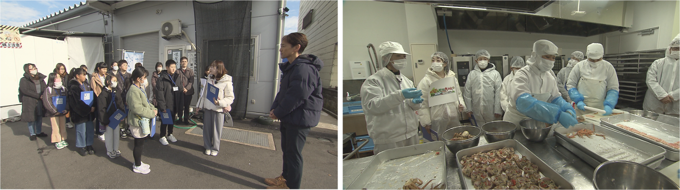 子供たちは保護服を着用した上で特別に加工場に入らせてもらい、世界に届けられる様子を目の当たりにしました。越前がには大きさにばらつきがあるため加工する際に全ての行程で機械化することが難しく、熟練の手作業が不可欠な点や、廃棄削減・副産物の活用(加熱加工商品や道の駅・ふるさと納税向け商品など)に取り組んでいることを学んでいました。