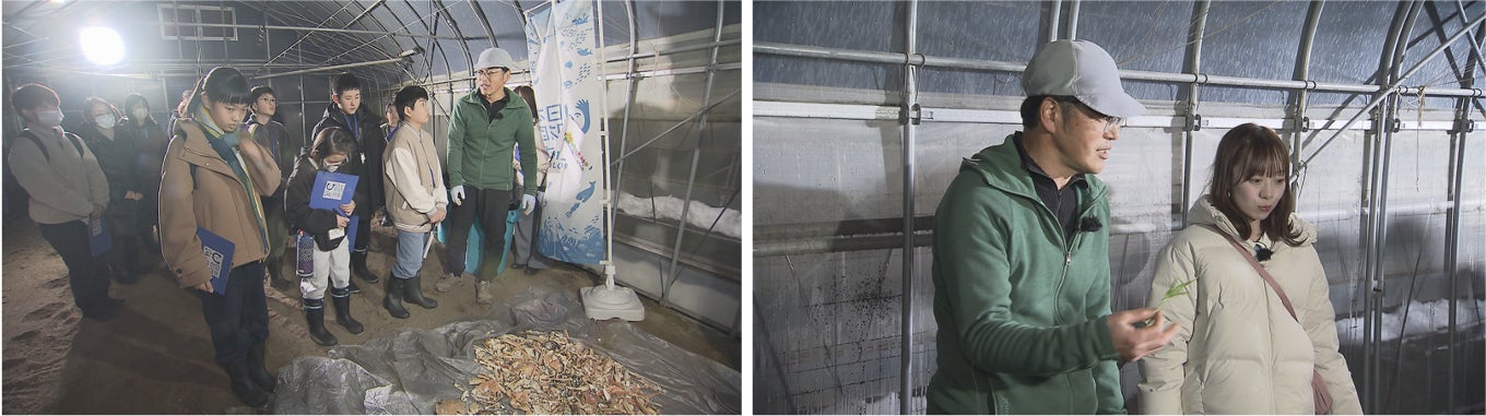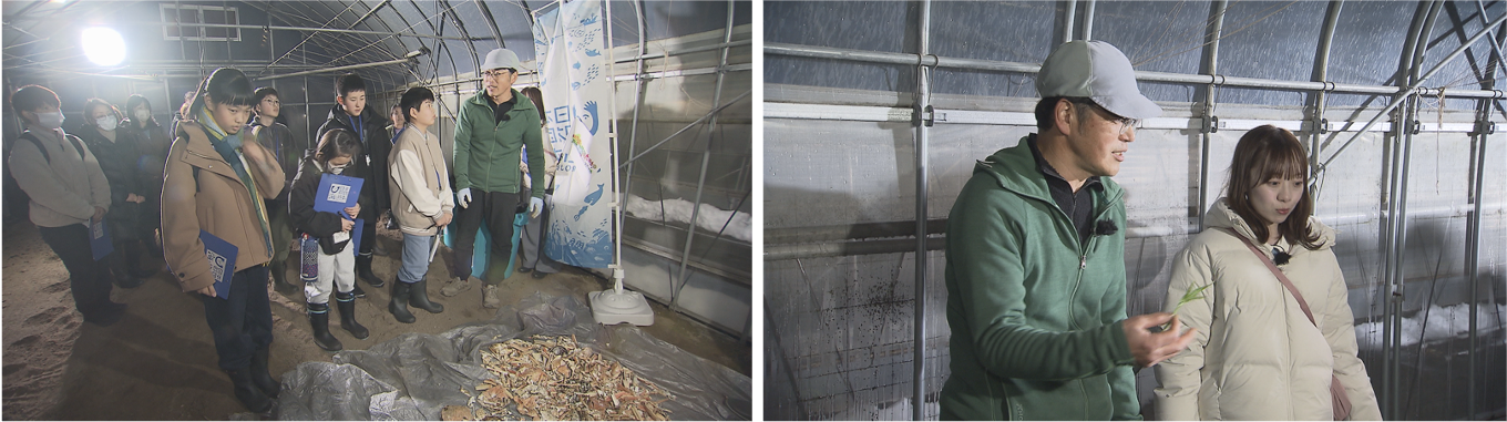 バスツアーの最後にやってきたのはあわら市で農業に取り組む麻王伝兵衛さんのビニールハウス。中に入ると大量の蟹がらが子供たちを出迎えました。麻王さんから芦原温泉の旅館から出る大量の蟹がらを乾燥させ砕いて土に混ぜ、野菜づくりに活かす取り組みだと説明がありました。