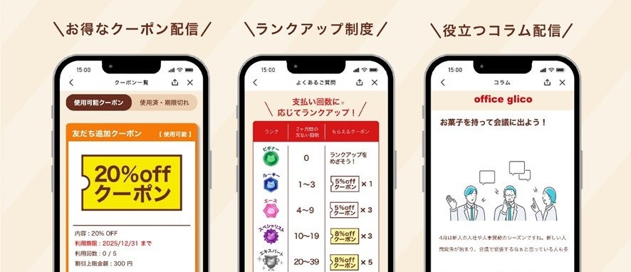 さらに、働く日々を楽しくすこやかに過ごしていただけるように、お得なクーポンの配信に加え、お支払い回数に応じて会員のランクが上がる制度を導入するほか、健康に関するさまざまな情報を提供します。