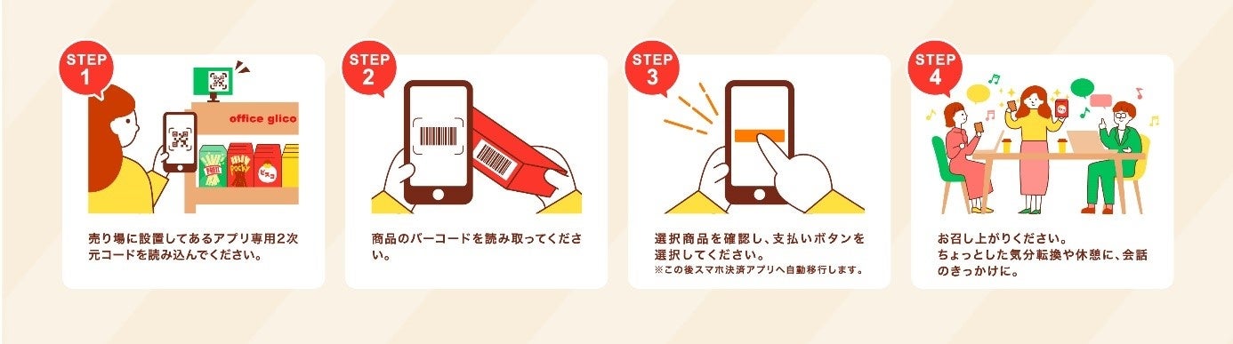 本日よりサービスを開始したオフィスグリコアプリは、ご利用者がスマートフォンで商品バーコードを読み取ると、電子決済(コード決済)に連携し、手軽に決済できます。これまで必要だった、ご自身で商品の価格を入力する手間を省けます。