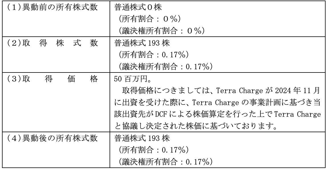 当社の理念「価値創造経営の力で、もう一度豊かになる」のもと、THE WHY HOW DO COMPANY株式会社(本社:東京都新宿区、代表取締役社長:岩尾俊兵、東証スタンダード:3823、以下「ワイハウ」)は、2025年3月3日、開催の取締役会において、Terra Charge株式会社(代表取締役 徳重徹、東京都港区芝浦一丁目1番1号、以下「Terra Charge」という。)の株式を取得することを決議いたしましたので、下記の通り、お知らせいたします。