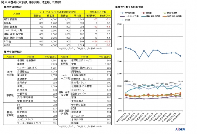 - 関東4都県全体の平均時給は、前年同月比2円減の1,014円