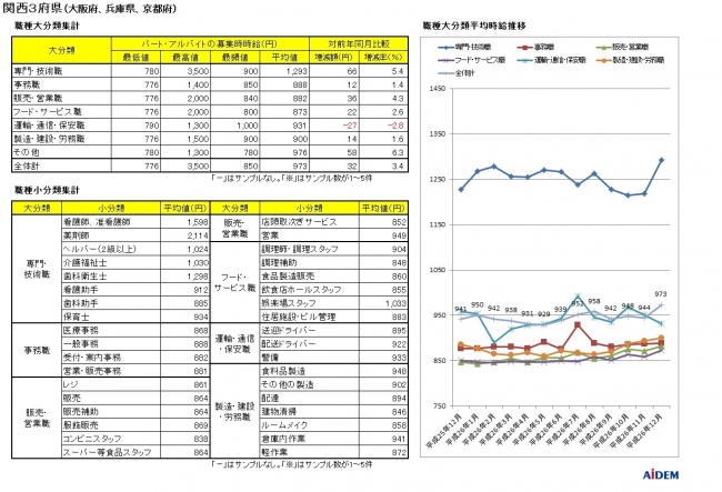 府県別の平均時給は、大阪府1,019円(前年同月比63円増)、京都府926円(同17円増)、兵庫県912円(同17円減)の順で、前年同月比でプラスが2府県、マイナスが1府県となった。