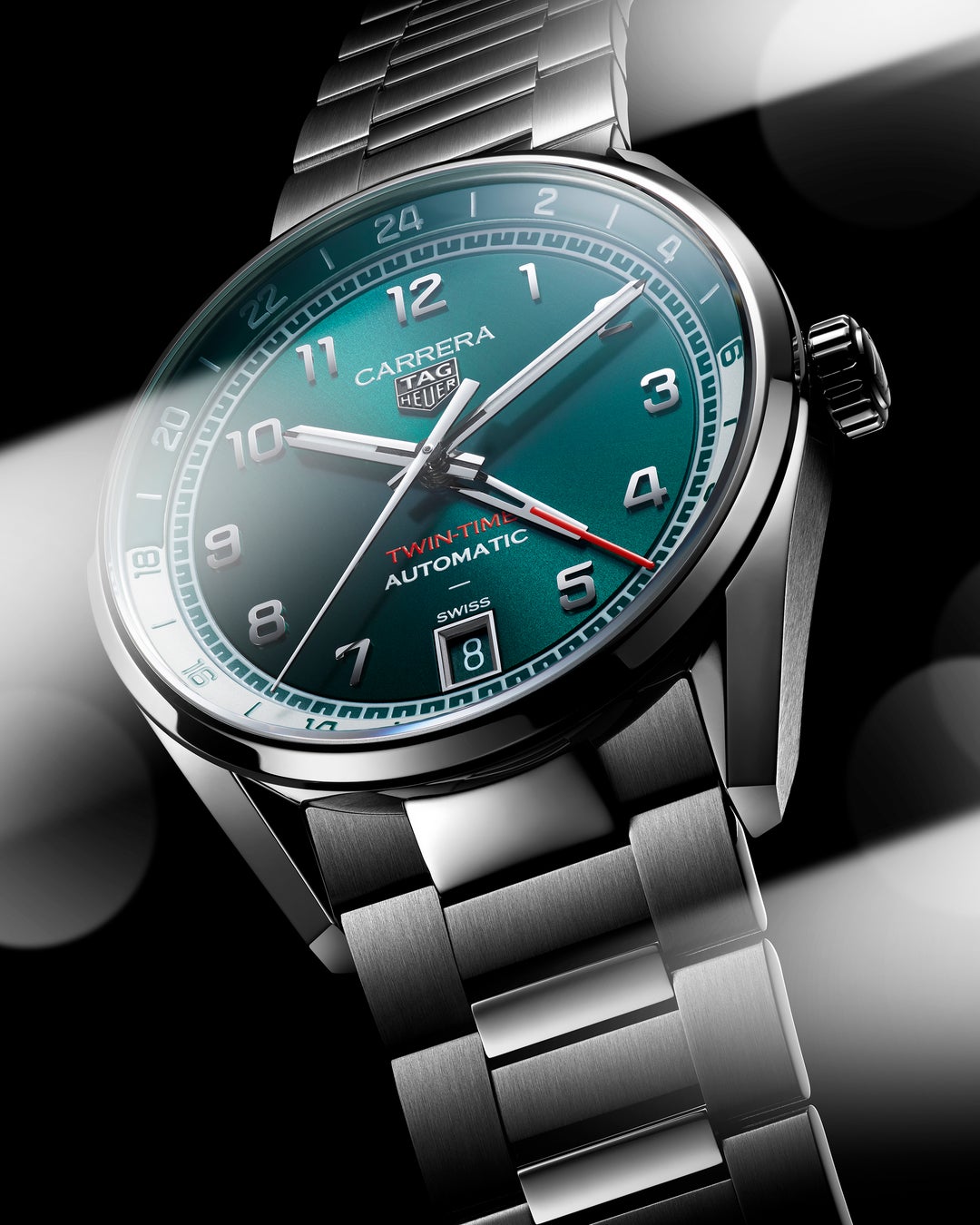 特に注目すべきモデルが、今回のコレクションの主役を務める「タグ・ホイヤー カレラ デイト ツインタイム」。モータースポーツの黄金時代を彷彿させるレーシングカーのカラーリングに着想を得たティールカラーを纏ったサンレイ加工サテン仕上げのダイヤルは、ツートーンカラーのフランジによって見る人を瞬時に魅了する視覚的インパクトを放ちます。ブランドの伝統を受け継ぐ「タグ・ホイヤー カレラ GMT」にインスパイアされた先端部分を赤くしたGMT針は、目の肥えた時計愛好家に贈る控え目なオマージュ。その形状は、時計師が使うピンセットのような精密工具をそれとなく連想させます。ロジウムコーティングを施したアラビア数字と組み合わされることで、機能性が高まり、世界を飛び回る人にとっての洗練された実用的なモデルが誕生しました。