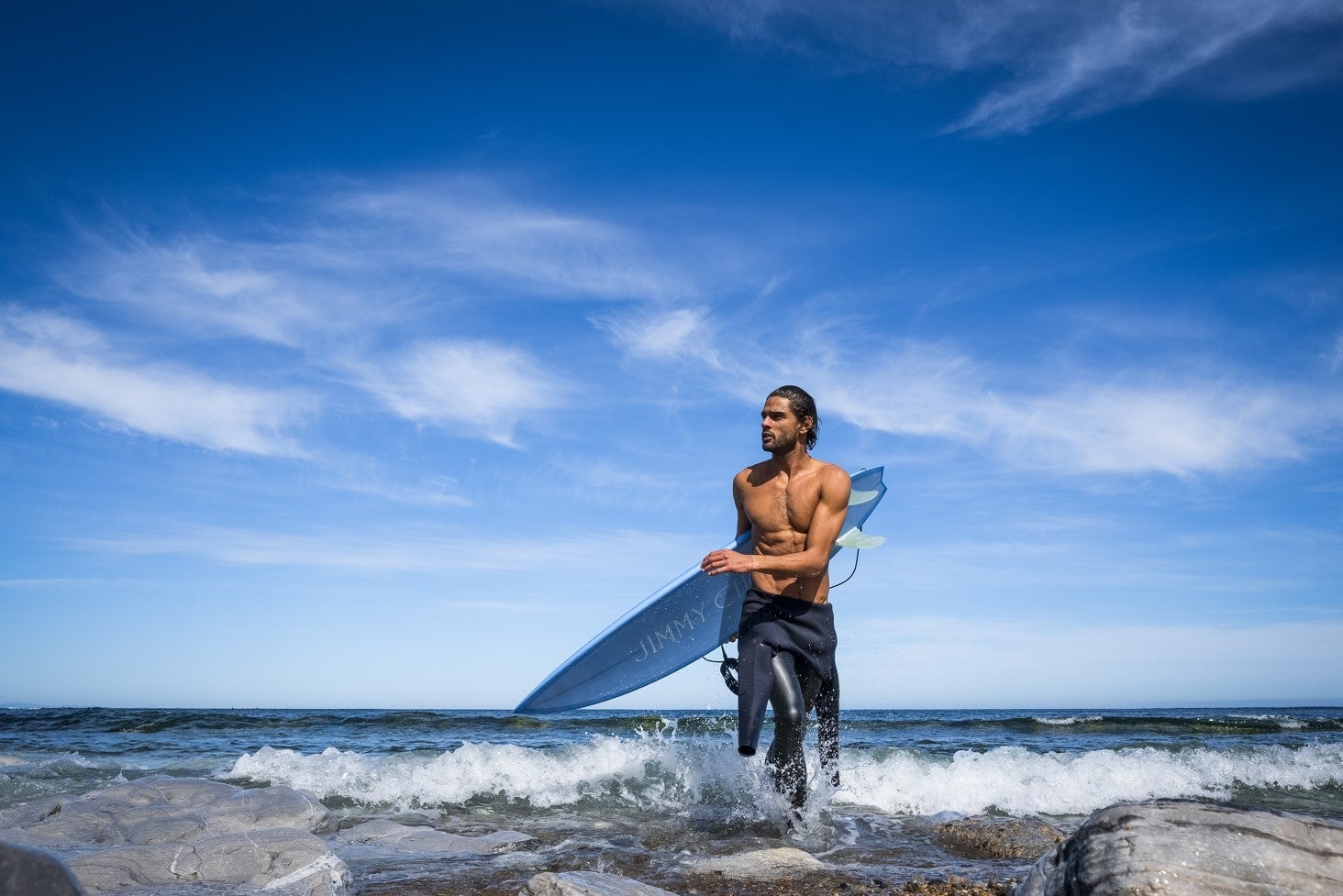 ウェットスーツ姿でサーフボードを抱えて砂浜に上がり、陽射しを浴びながらほほ笑むテシェイラの姿は、クールで自信に満ちた現代の男性像を象徴しています。生まれながらにしてエレガントなセンスを備えた自由奔放な男、テシェイラはまさに「ジミー チュウ マン アクア」を体現する存在です。
