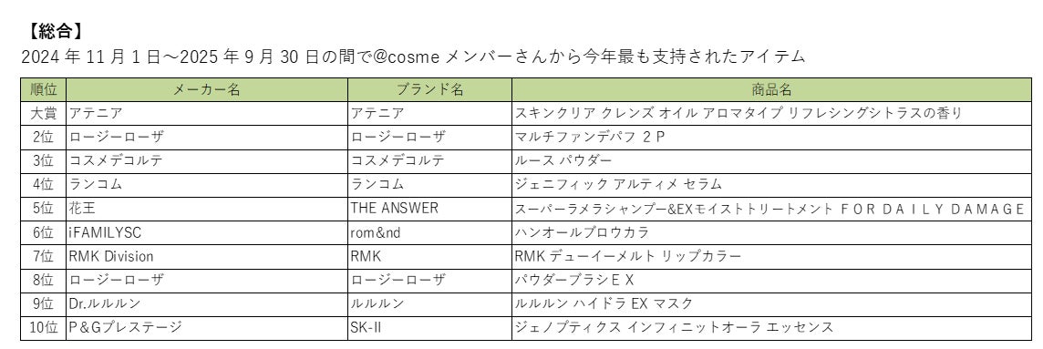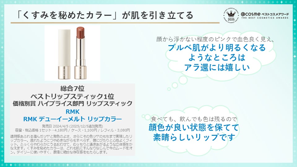 「@cosmeベストコスメアワード2025」は、生活者のクチコミに加え、どのくらい注目された商品かなどを加味して、順位を決定しています。