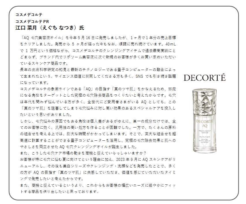 その他、11,000円と高価格帯にも関わらず、店舗やECの下半期ベストヒット賞を受賞したコスメデコルテ「AQ 毛穴美容液オイル」も発売前から”角栓を溶かす”とSNSでも話題になりました。店頭でもサンプルを希望するお客さまやテスターに触れるお客様が多く、販売後は即メーカー欠品になるなど2025年の話題をさらったアイテムの一つとなりました。