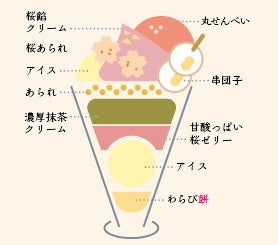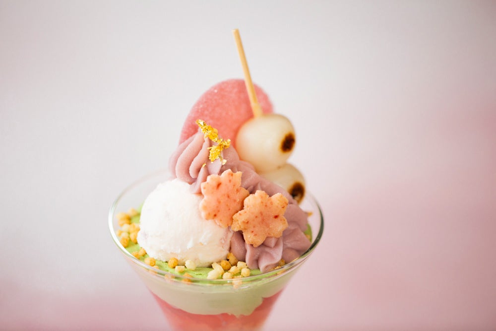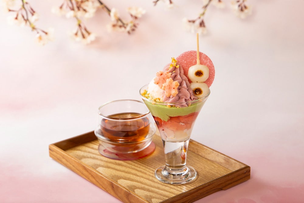 春の訪れを感じる、華やかな「さくらパフェ」。 桜風味のクリームやゼリーに、濃厚抹茶クリームやわらび餅を合わせた和スイーツ。香ばしい串団子やサクサクの桜あられが食感のアクセントに。金箔を添えた美しい見た目も魅力。春限定の特別な味わいをお楽しみください。