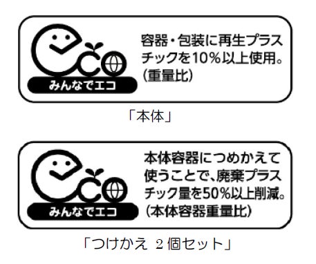 本体の包装プラスチック資材(ブリスター)は、再生プラスチックを100%使用しています。また「つけかえ」を使用することで「消臭力 トイレ用」と比較して廃棄物量を約85%削減します。これにより、エステーが独自に策定している環境配慮評価基準を満たすことから“みんなでエコ”マーク(下)を表示しています。