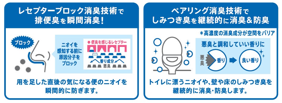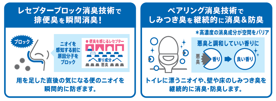 レセプターブロック消臭技術 (※3)により、用を足した直後の気になる便のニオイを瞬間的に防ぎます。また、ペアリング消臭技術(※4)によりトイレに漂うニオイや、壁や床のしみつき臭を継続的に消臭・防臭します。