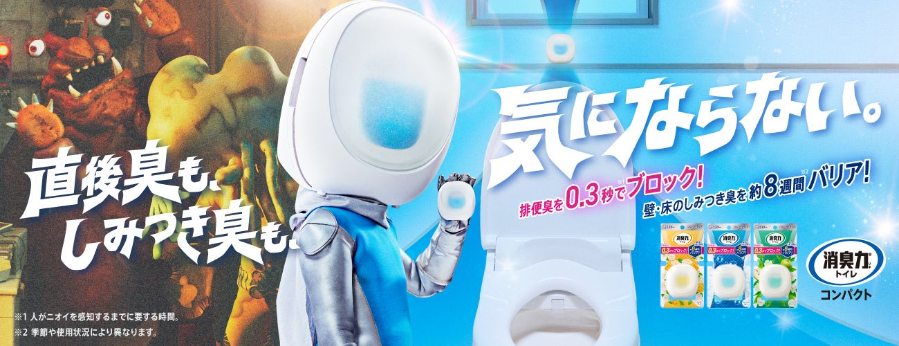 このようにトイレ空間においてニーズの高い「排便直後のニオイ」と「壁・床のしみつき臭」の両方の対策ができる「消臭力 コンパクト トイレ用」を新たに開発しました。