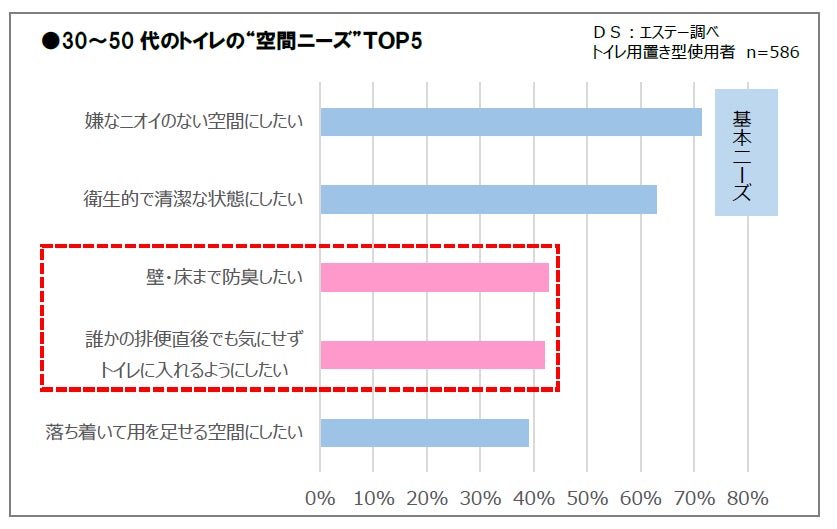 トイレ用消臭剤の置き型タイプの使用者を対象に行った調査(エステー調べ)によると、30~50代のトイレの〝空間ニーズ〟について、「嫌なニオイのない空間にしたい」「衛生的で清潔な状態にしたい」とする基本ニーズに加え、「壁・床まで防臭したい」「誰かの排便直後でも気にせずトイレに入れるようにしたい」といった回答が多くなっています。