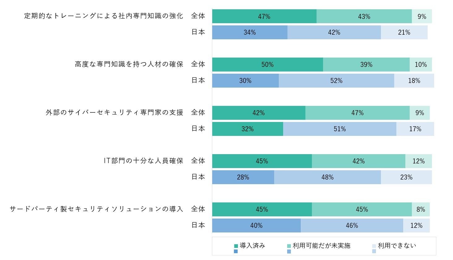 ・外部のサイバーセキュリティ専門家の支援を活用していない、または利用できない:56%(日本68%)