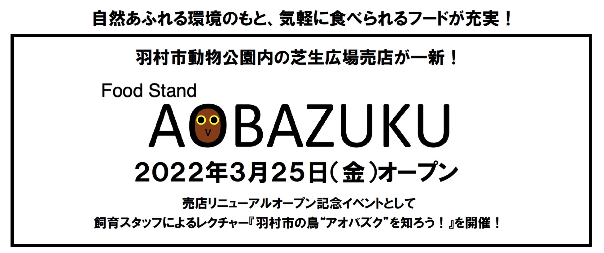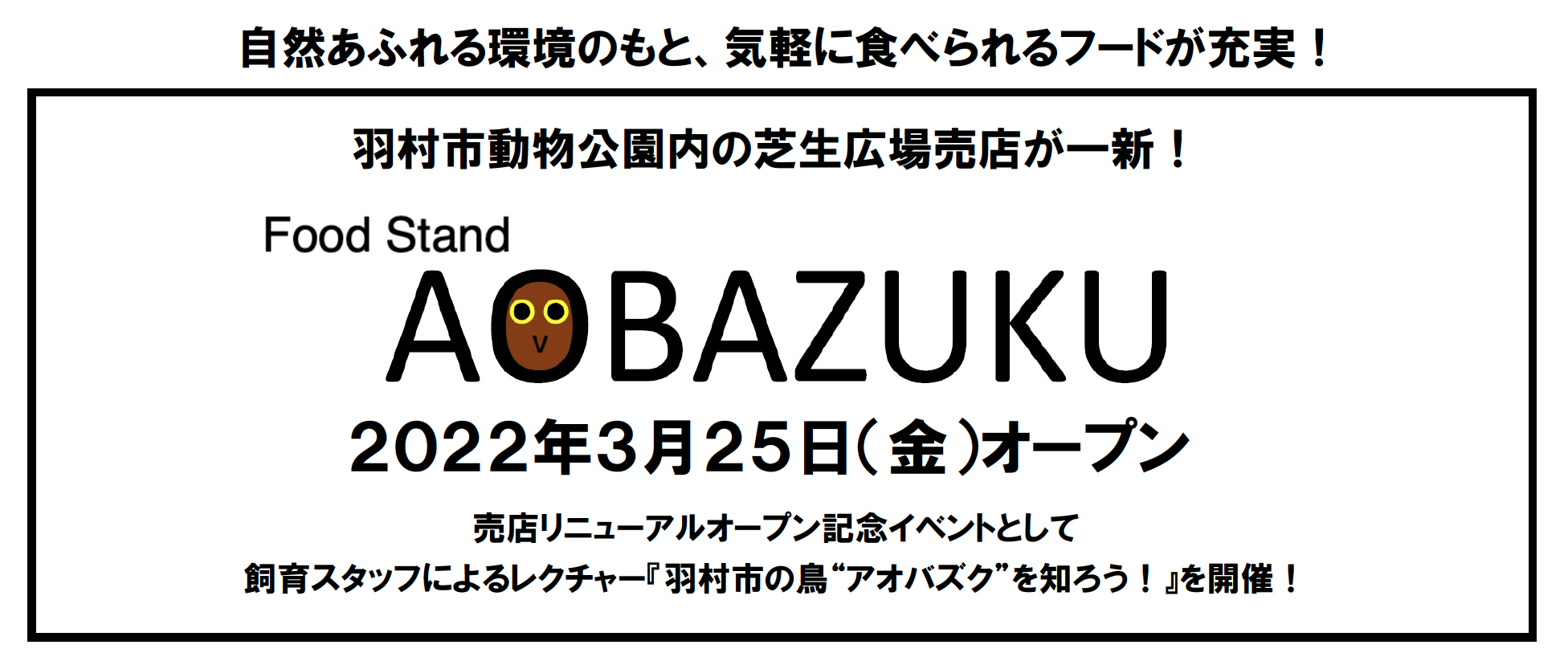 新店舗「AOBAZUKU」は、羽村市の市鳥である「アオバズク」のように市民の皆さまをはじめ来園されるすべての方にとって自然との調和を感じ、家族など親しい方との憩いの場となることを目指してリニューアルいたします。