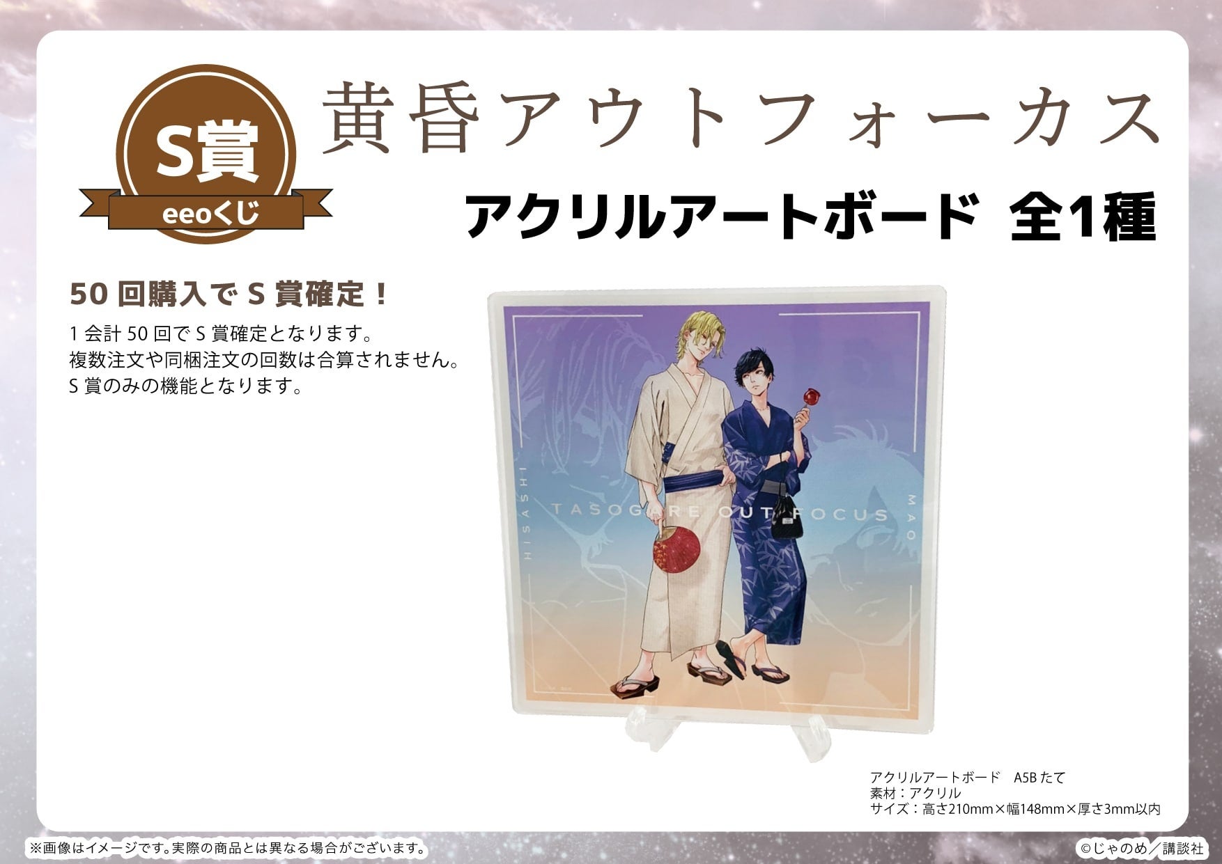 目玉景品のS賞には、『黄昏アウトフォーカス』の新規描き下ろしイラストが使用された18×18cmのアクリルアートボードが登場です。