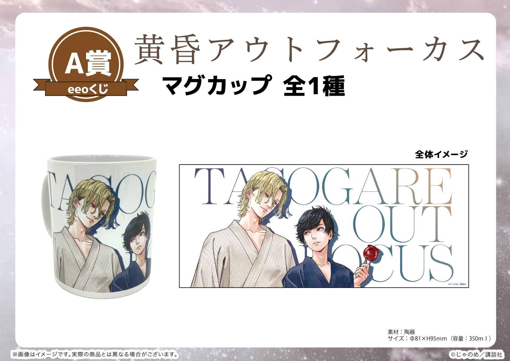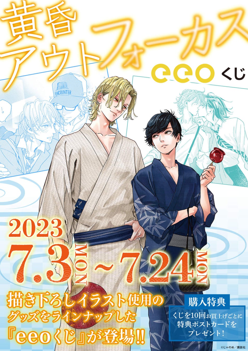 今回のeeoくじには『黄昏アウトフォーカス』と、『残像スローモーション』『宵々モノローグ』が登場。新作グッズを「eeoくじ」でGETし、じゃのめ先生が描く尊いアオハルの世界にどっぷり浸かってみてはいかがでしょうか?