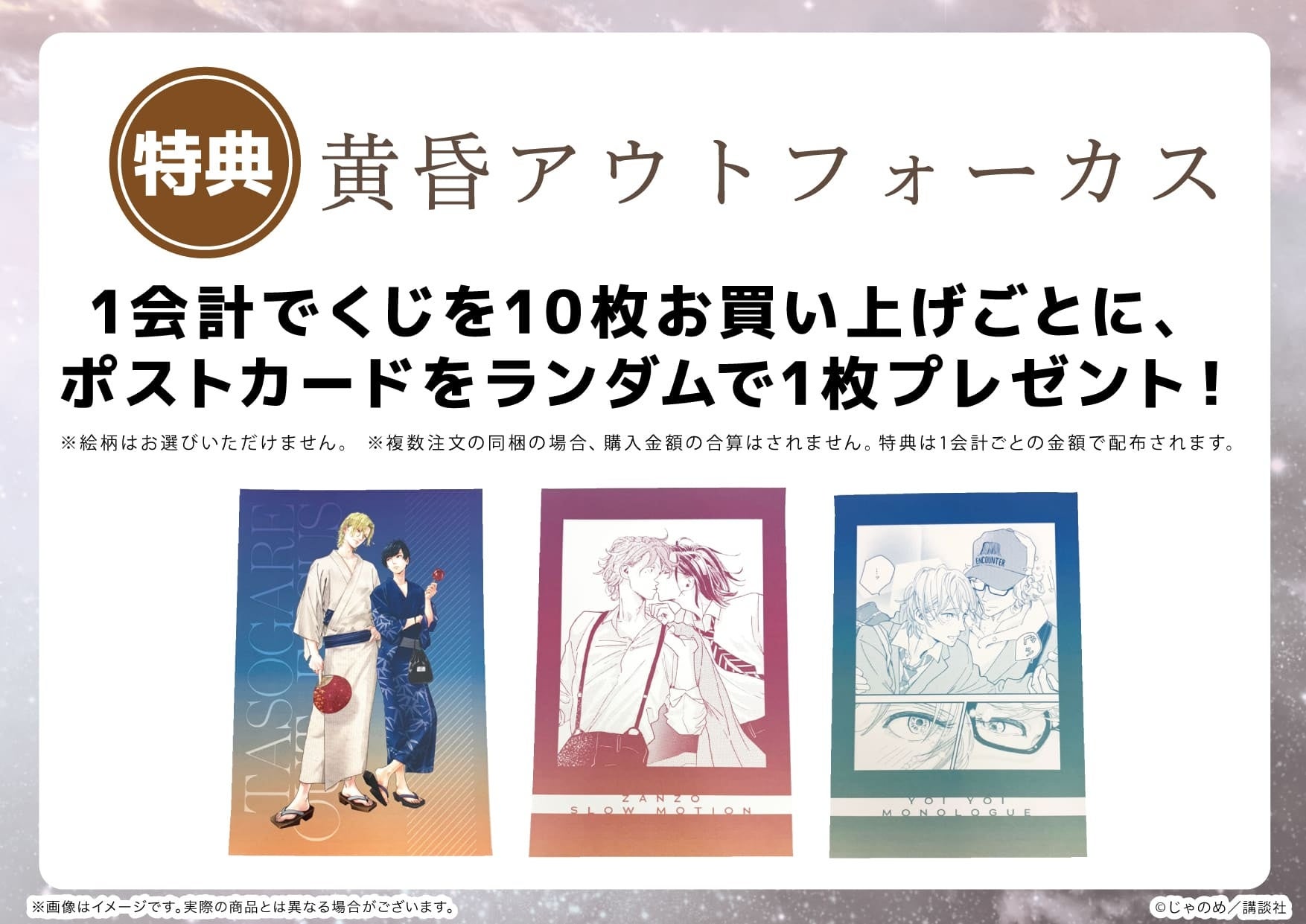 『黄昏アウトフォーカス』シリーズの「eeoくじ」を1会計で10枚お買い上げごとに、特典ポストカード(全3種)をランダムで1枚プレゼント! 新規描き下ろしイラストや公式イラストを使用した、ここでしか手に入らない限定品です。くじでGETしたアイテムと一緒にぜひ飾ってください!
