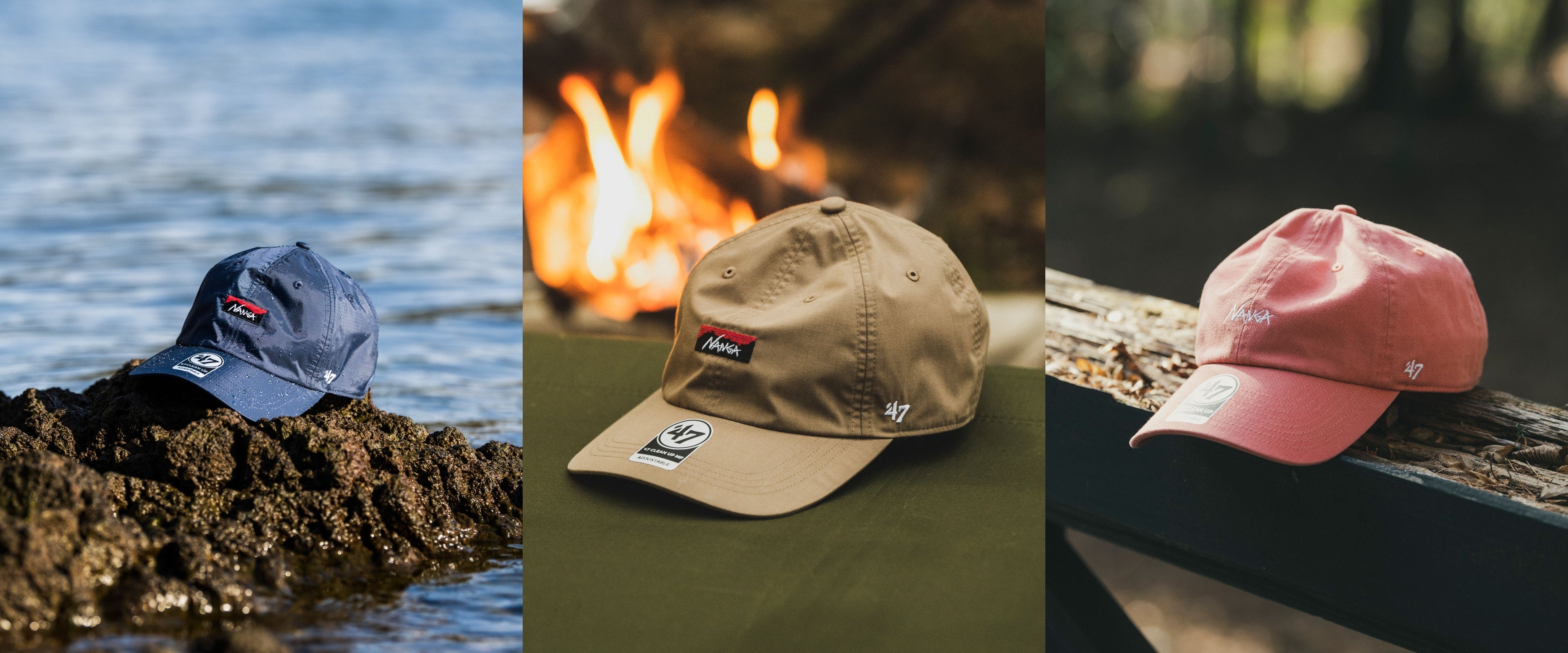 本コレクションは、カーブドバイザーキャップ「CLEAN UP MF (クリーンナップ・ミッドフィット)」をベースモデルとしてフィーチャーし、NANGAのオリジナル生地である「AURORA-TEX® (オーロラテックス®)」と「HINOC(ヒノック)」を採用したアイテムを展開。また、「CLEAN UP (クリーンナップ)」をベースモデルにした、’47オリジナルのウォッシュドコットン生地のモデルもラインアップしています。