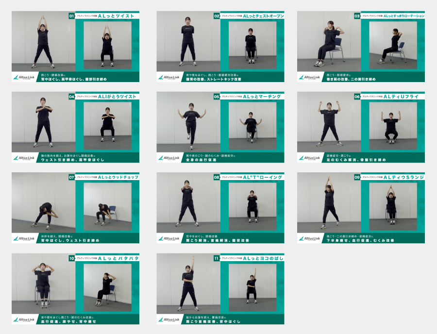 「アルティウスリンク体操」は、全11種類の動作で構成されており、1セット約2分30秒で実施できます。動作や名称には「A」「L」など社名のイメージを取り入れることで、企業アイデンティティを高めるとともに、従業員が親しみやすく一体感を持って取り組める健康習慣となることを目指しています。また、それぞれの動作については手本となる動画を用意し、YouTubeで展開することで、勤務場所を問わず誰でも気軽に体操に取り組める環境を整えました。