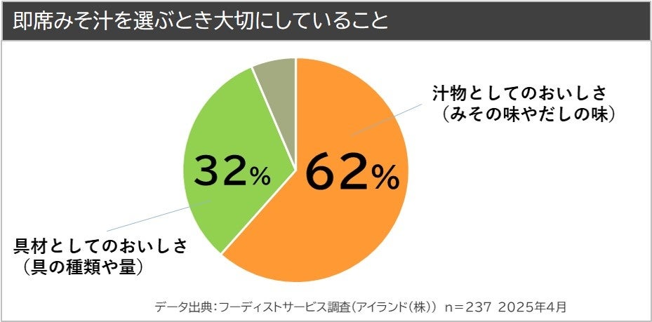 昨今の不安定な経済情勢を受けて、食においてお客様が「安心・信頼感のある」ものを重視・選択される傾向が見られます。「お客様が即席みそ汁を選ぶときに大切にしていること」について調査したところ、「汁物としてのおいしさ(みそ・だしの味)」を重視することがわかりました。