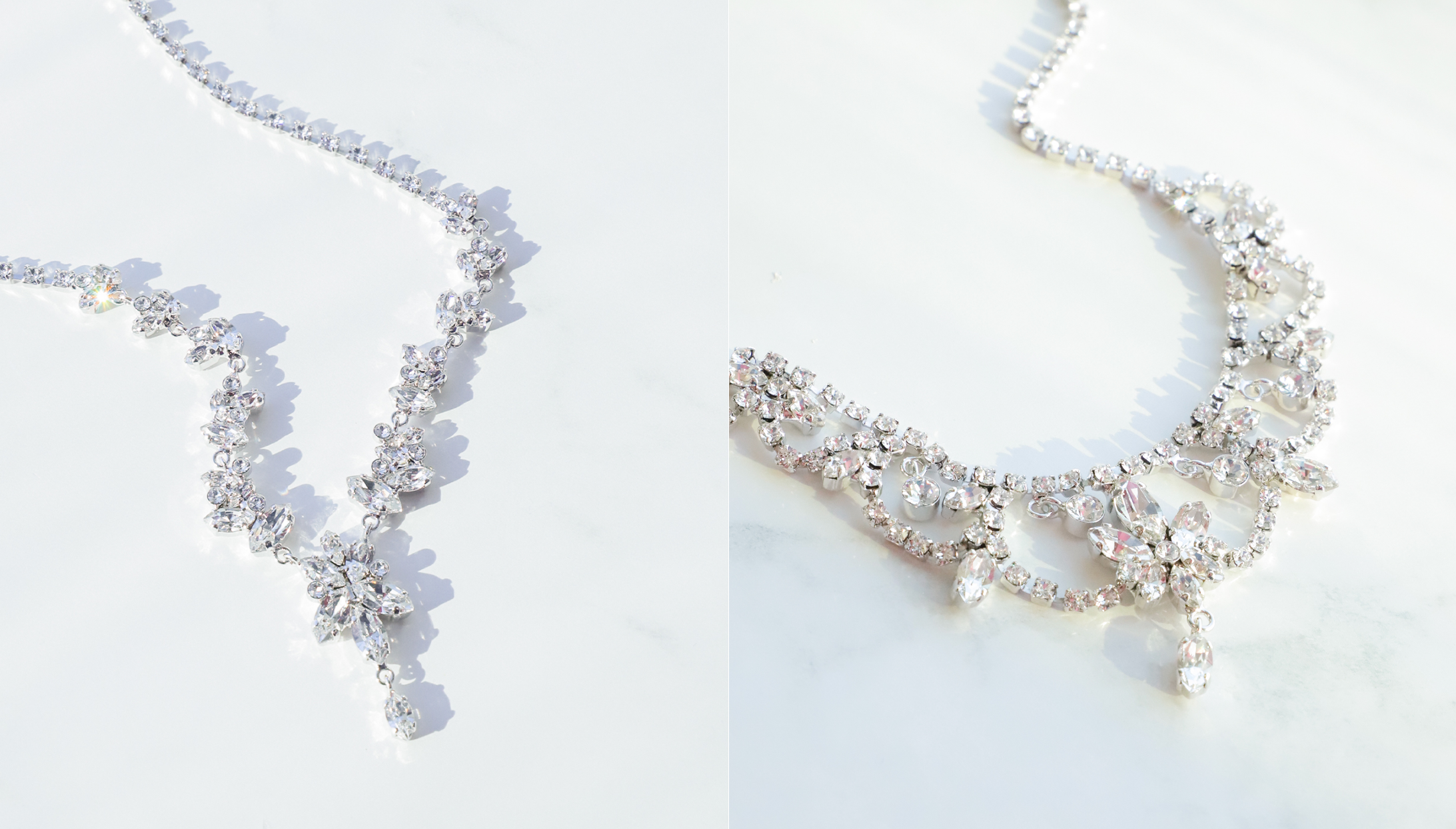 (右)レースモチーフのネックレス。フェミニンで可愛らしい印象になります。同シリーズのイヤリングやティアラと合わせたコーディネートもおすすめです。