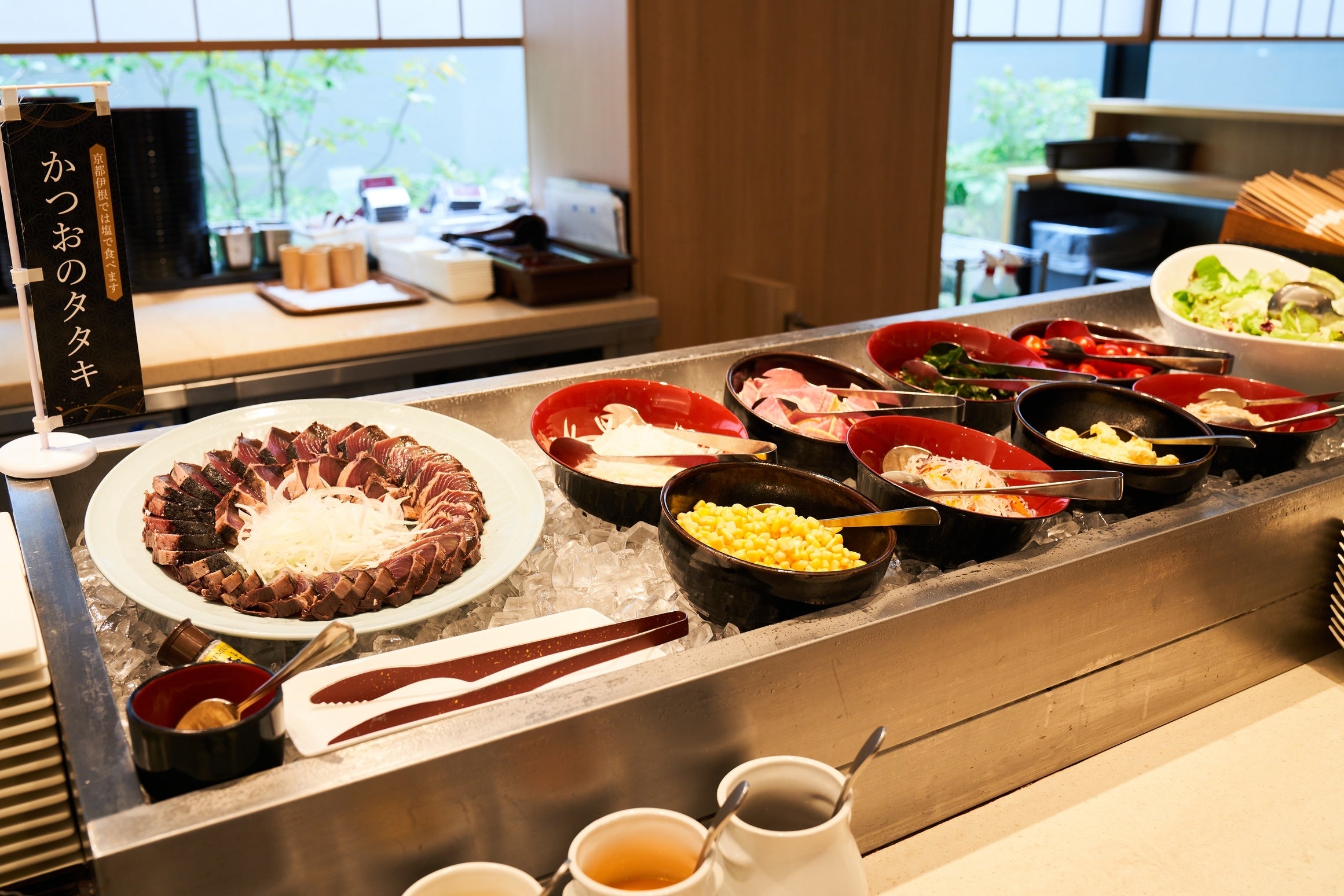 ビジネスカテゴリ2位の京都府「リッチモンドホテルプレミア京都駅前」では、京料理をコンセプトとした約60種類の豊富なメニューを楽しめる朝食ブッフェを提供しています。ブッフェ内のライブキッチンでは、国産黒毛和牛や鰤のしゃぶしゃぶを注文が入ってから目の前で調理して提供するスタイルが人気を集めました。九条ネギのすき焼き風や鱚の天ぷらなどの京都らしいメニューに加えて、ちらし寿司に好みの刺身や薬味をトッピングできるオリジナル海鮮丼、自家製のプリンなども提供しています。2024年1月に朝食をリニューアルし、新しいメニューが加わっていることも宿泊者の満足度につながりました。クチコミでは、「朝からしゃぶしゃぶなんて贅沢でした」などの声が寄せられています。