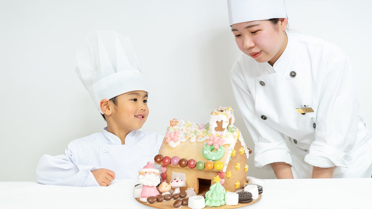 お子さま用のコックコートを着用し、パティシエ気分を味わえるお菓子の家づくり体験。体験後には、思い出に記念写真をプレゼントいたします。