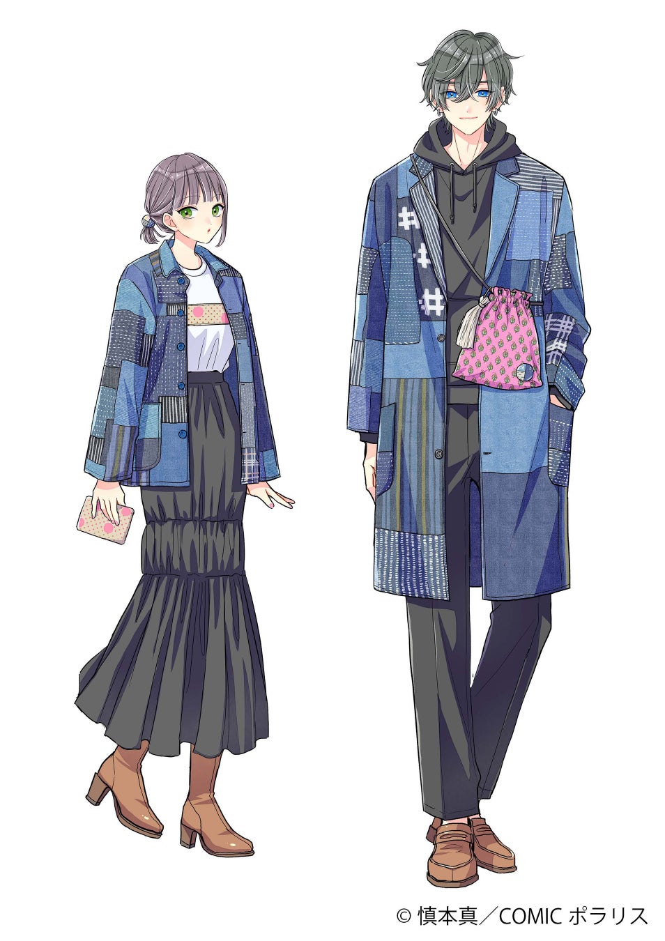 『推しが我が家にやってきた!』作者・慎本真氏による「刺し子」アパレルブランドの「TERAS」のアイテムを身につけた「さっきゅんとすみれ」の描き下ろしイラストを公開します。こちらのイラストは等身大パネルとして会場内に設置するほか、アクリルスタンドとして販売いたします。