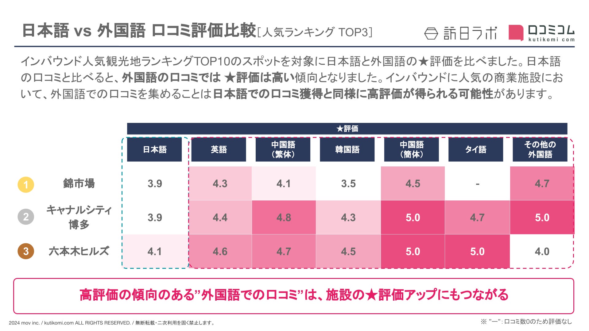 インバウンドに人気の商業施設において、外国語での口コミを集めることは日本語での口コミ獲得と同様に高評価が得られる可能性があります。