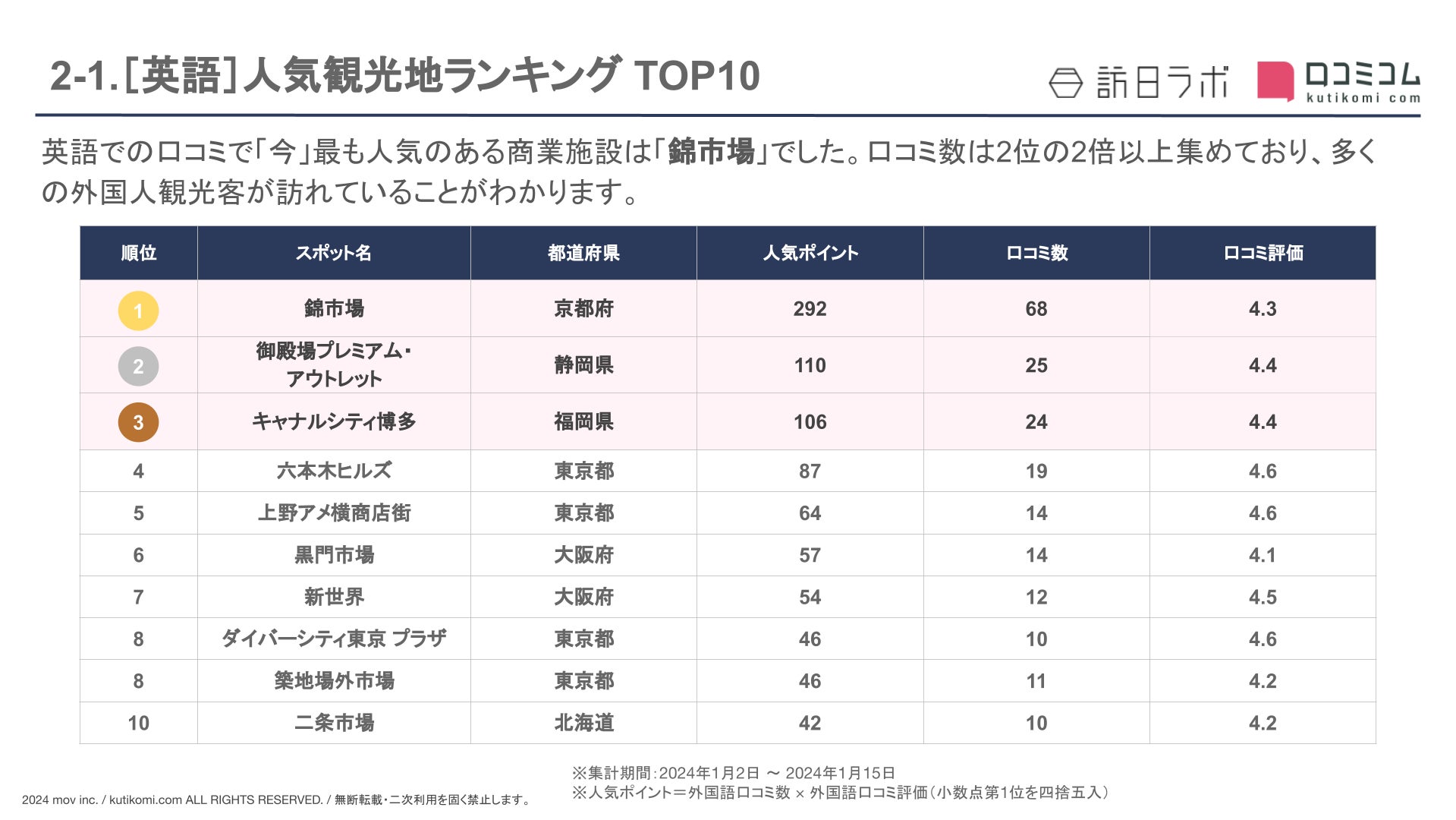 英語での口コミで「今」最も人気のある観光スポットは「錦市場」でした。東京都から4施設、沖縄県から2施設がランクインしました。