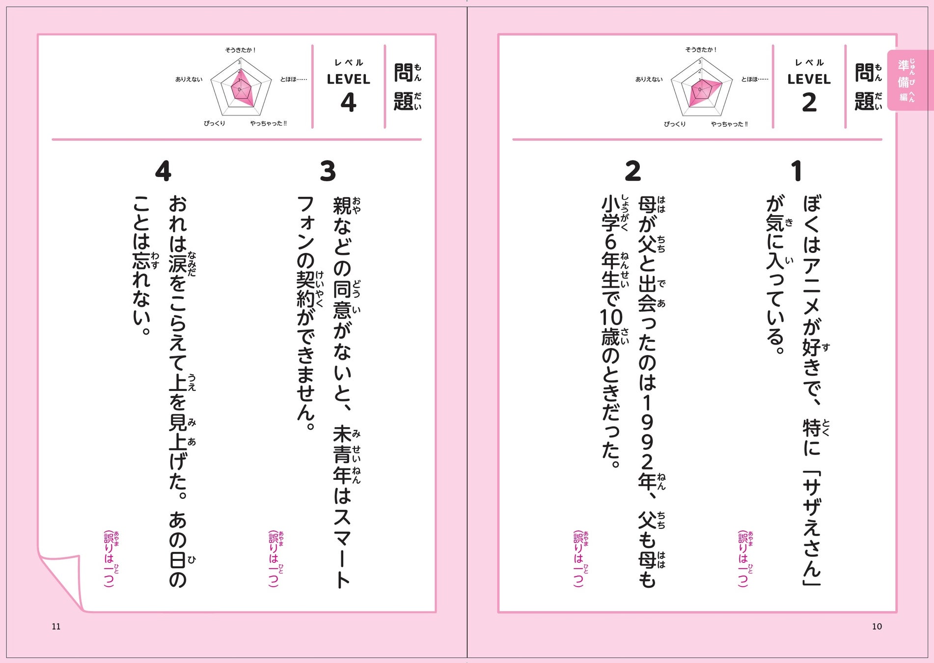 問題は「準備編」(文中に誤りが1~2個)、「練習編」(文中に誤りが3個)、「本番編」(文中に誤りが5個)に分かれ、計50問用意されています。