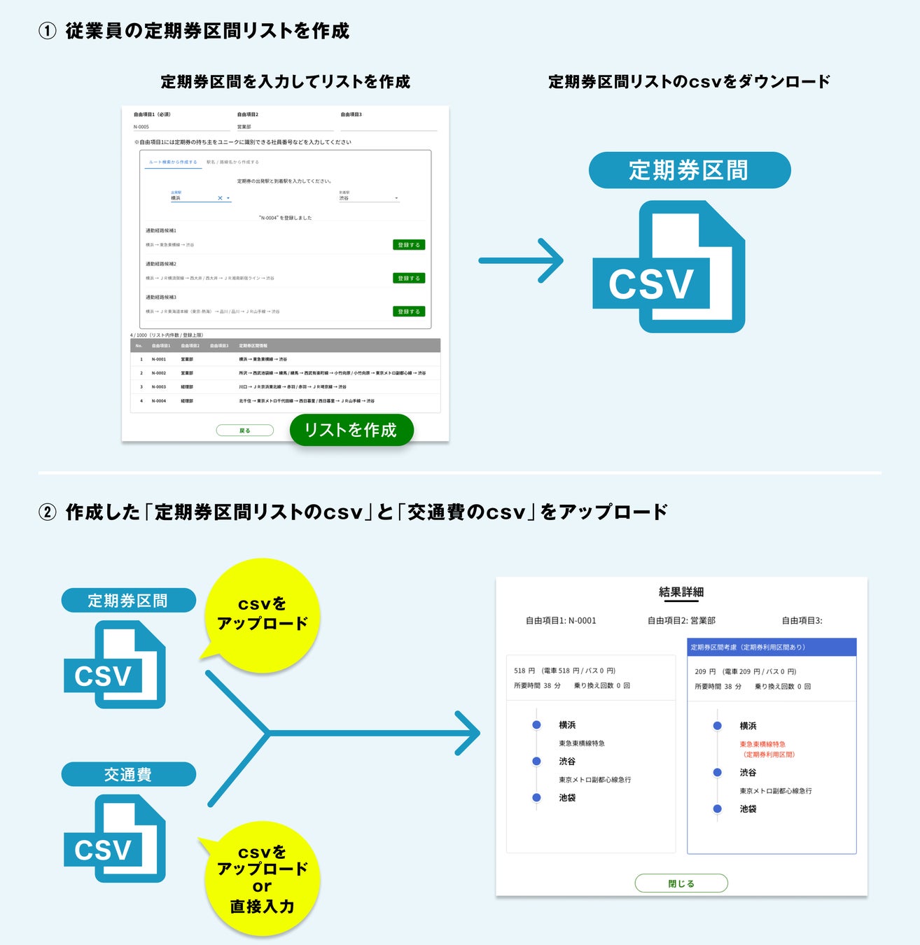 あらかじめ『NAVITIME Tools』の「交通費まとめて検索」のサイト上で、従業員の定期券区間を登録して「定期券区間リスト」を作成しておきます。「交通費まとめて検索」をする際に「定期券区間リスト」をアップロードすると、自由項目に設定した社員番号などの社員を識別できる項目で紐づけをし、従業員ごとに、定期券区間を考慮した交通費の検索が可能となります。定期券区間リストは、1度作成して保存しておけば繰り返し利用できます。