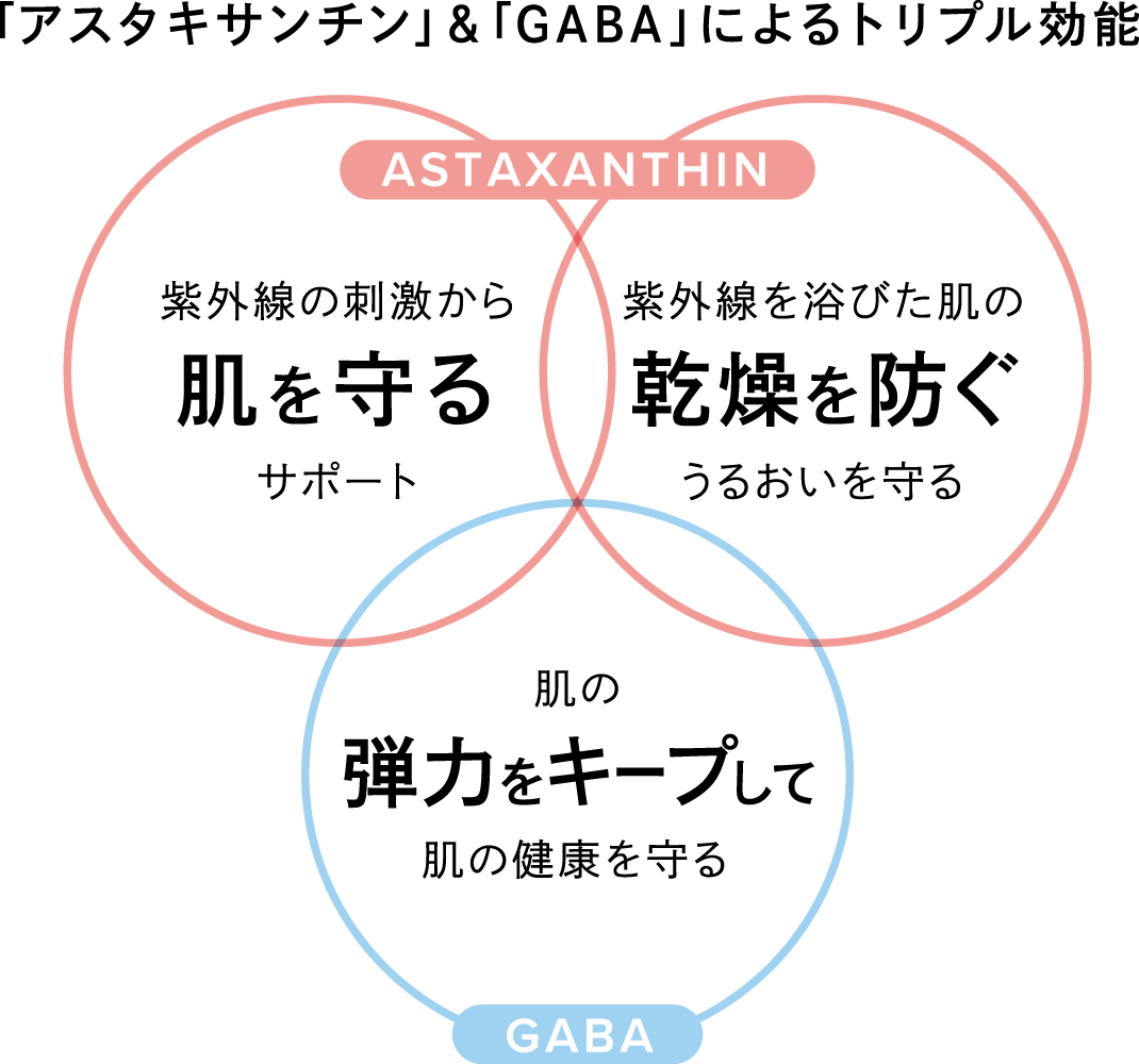 抗酸化作用を持つアスタキサンチンと弾力維持機能を持つアミノ酸GABAを配合。