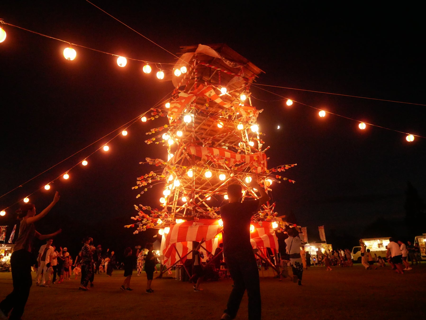 納涼盆踊り大会では、高さ約10mの巨大な盆やぐらの周りを“滑川音頭”や“ぼたん音頭”、“秩父音頭”などに合わせて、参加者みんなで踊ります。踊り方が分からない方にも、滑川町青年団によるレクチャーもあるので、安心してご参加いただけます。