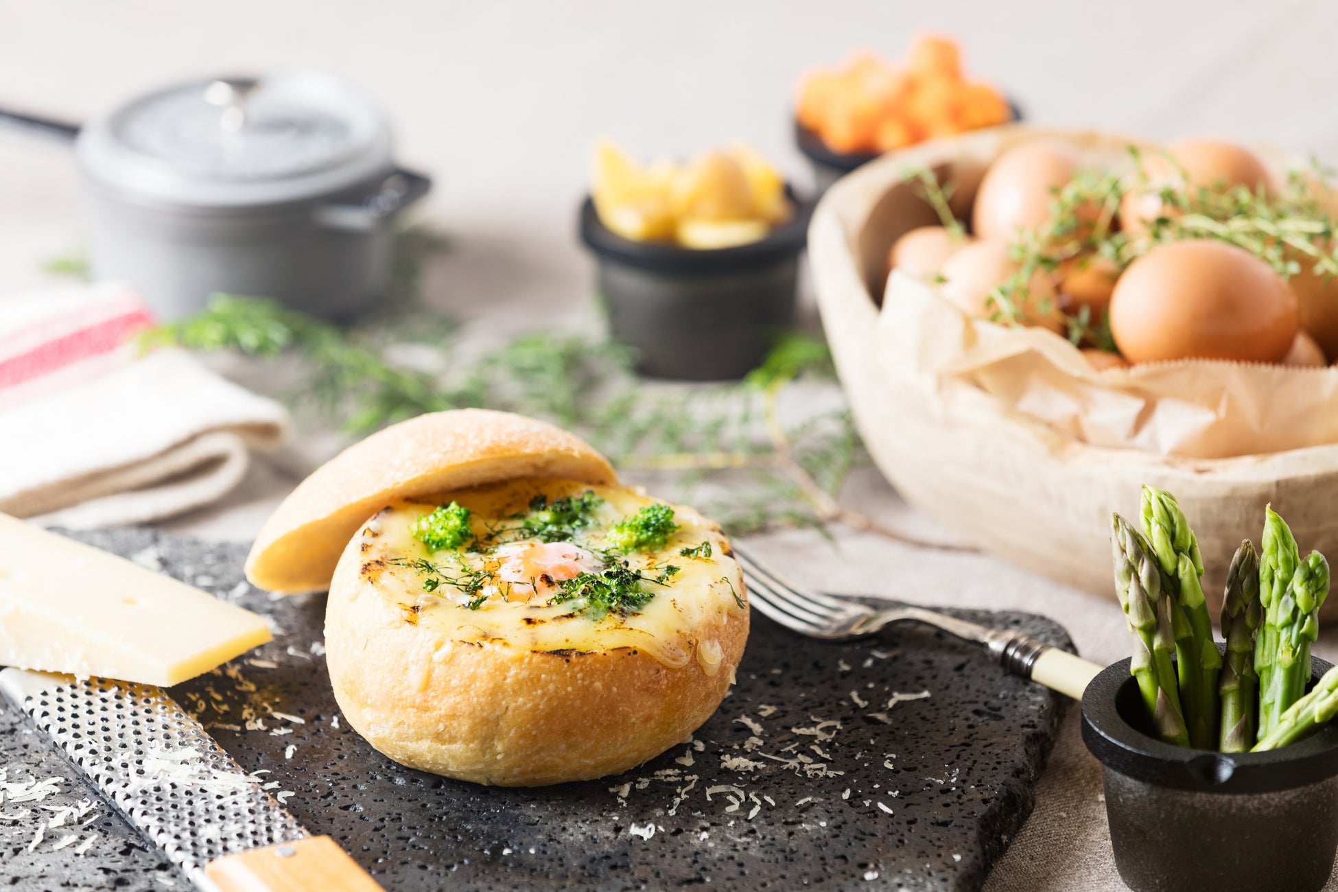 朝食は焚き火で作るブレッドボウルです。ダッチオーブンに丸型のパンを入れてシチューを注ぎ、焚き火を使って全体を焼き上げます。屋外で味わう温かい朝食で身体を目覚めさせます。