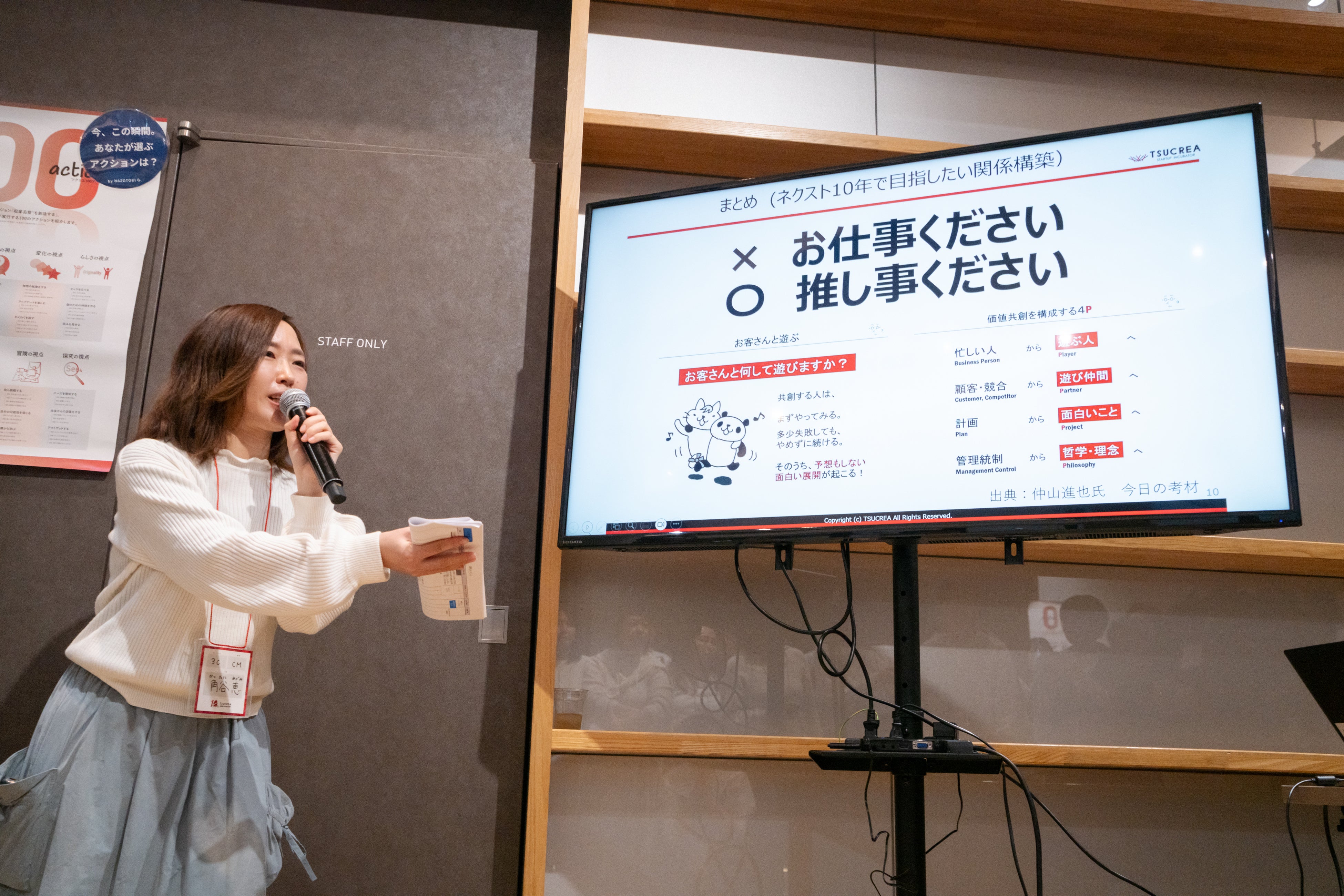 続く交流パートでは、クイズ企画や「なるほど the ツクリエ」、社員によるピッチコンテストなどの参加型コンテンツを実施。軽食や飲み物を囲みながら、仕事の枠を越えた対話が自然と生まれ、普段は接点の少ない社員同士がゆるやかに交流する場となりました。