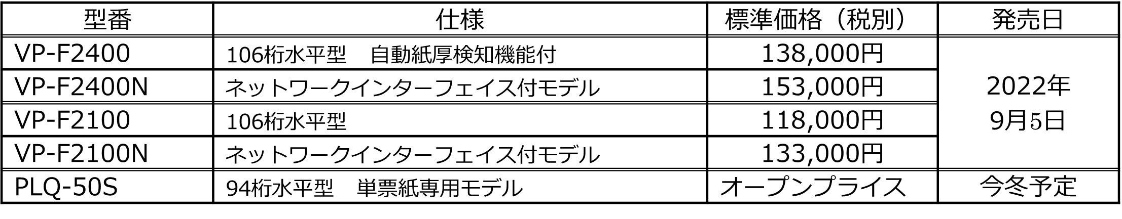 エプソンは、水平型ドットインパクトプリンターの新商品として、106桁の『VP-F2400』『VP-F2400N』『VP-F2100』『VP-F2100N』を、2022年9月5日より発売します。また、94桁の『PLQ-50S』を、今冬予定で発売します。