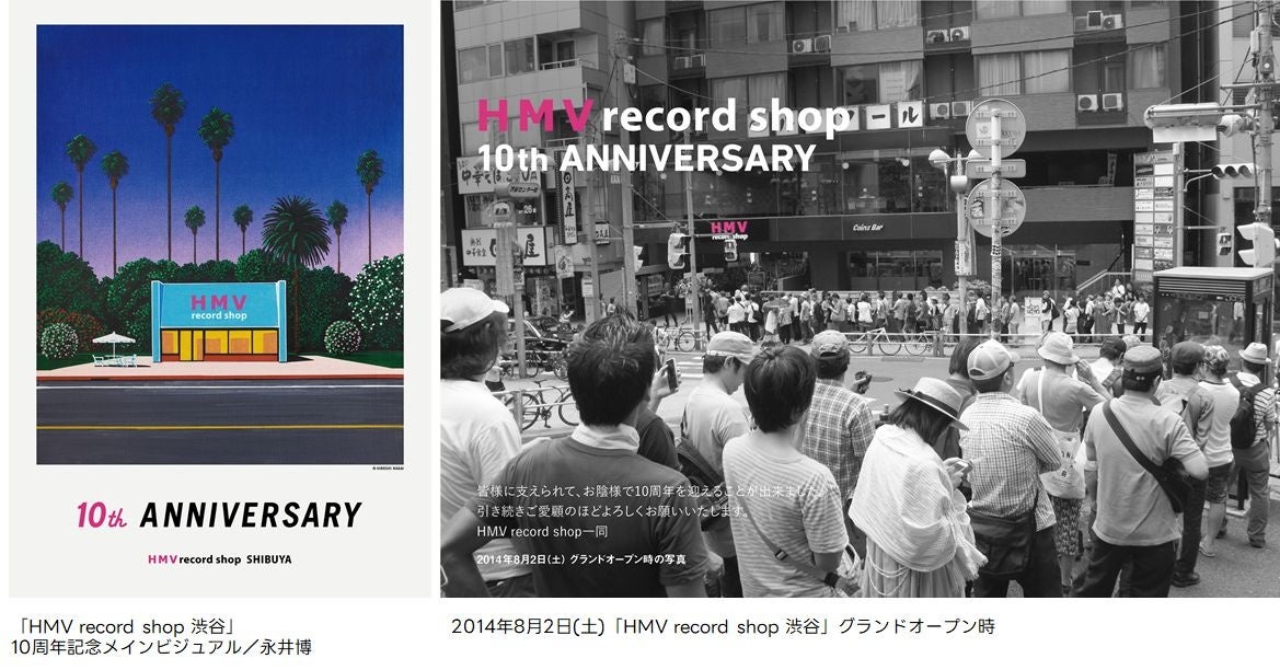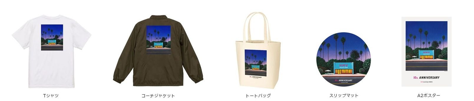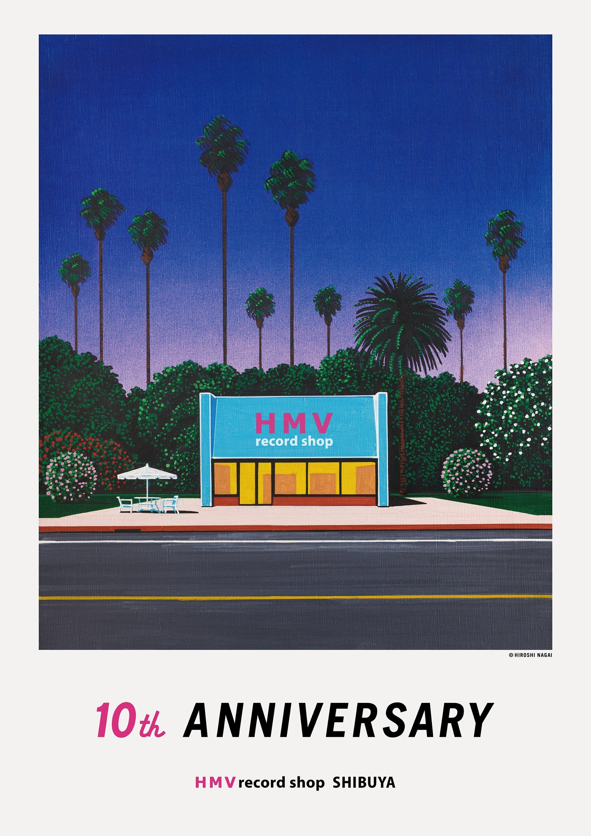 記念展示では、永井博氏描き下ろしの10周年記念メインビジュアル作品を中心に展示・販売するほか、10周年を振り返る歴代のHMV record shop 周年ポスターの展示や歴代のコラボグッズの展示・販売を行います。