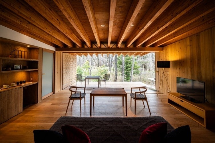 客室は、目の前に美しい自然が広がる1棟ごとに分かれた「スイートヴィラ」を全15室ご提供。約68㎡の室内に約14㎡のテラスからなり、無垢材を使用した自然と調和する心地の良い空間です。那須の天然水で沸かす半露天仕様のお風呂や、開放感のあるテラスから、那須の自然を満喫することができ、「水庭」やレストランの食事と共に、寛ぎのひとときをお過ごしいただけます。