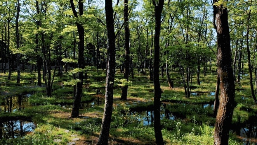 「現代の庭とはなにか?」という題材のもと、約50年前水田だった土地の歴史と、この場所にある自然の素材を生かし、昔と現代の景色を重ね合わせたような新しい景色を作りたいという考えから、自然と人とが共存するアート「水庭」を構想しました。現在の宿泊施設エリアにあった約三百数十本の樹林を采配しなおし、元々暗い環境であった森から、地面に太陽が当たる明るい環境へ変えていくことからはじめ、池の水は小川から水をひき、昔の水田を表現しました。また、この「水庭」では、元からある自然を活かし、少し整えることで、元々存在していたような、しかしながら自然界には存在しないような、新しい環境を作り上げることができました。夏には、池の水、陸の草、光と影が交わる環境が作られ、秋には、色づいた葉が池の中にたまる景色、冬には雪の白、影の黒のモノトーン景色に変化します。季節ごとに変化する「水庭」で、それぞれの景色で愉しんでいただきたいです。