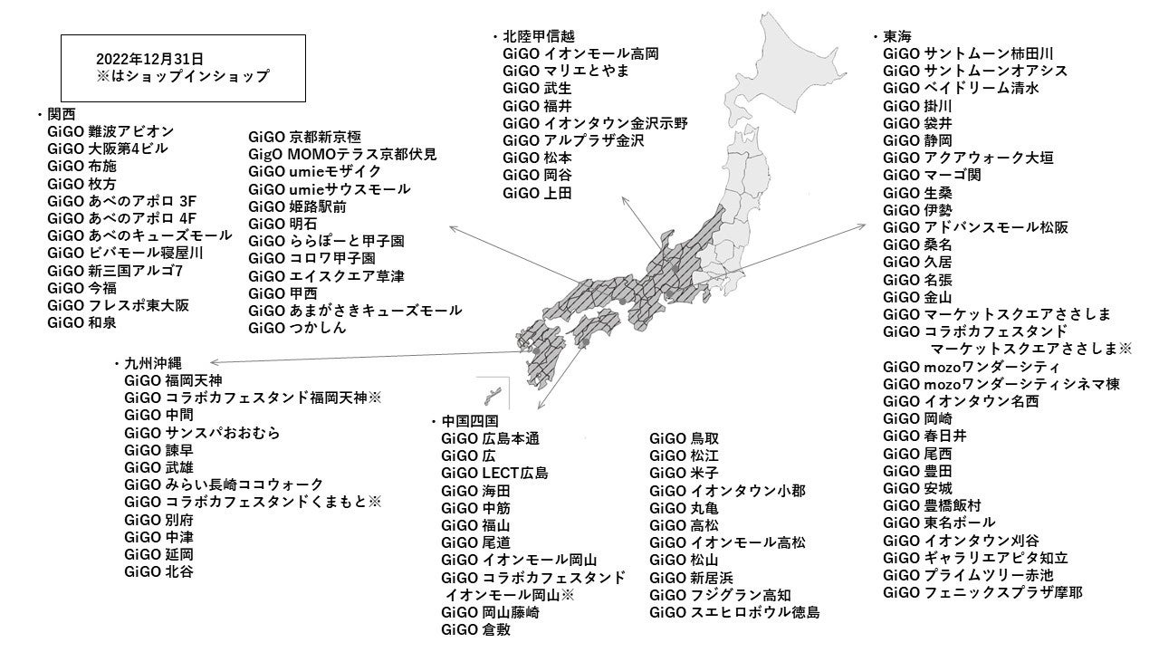 2022年3月9日に『GiGO 池袋1号館』からスタートした新生GiGOは、11月末日時点で148店舗まで拡大いたしました。12月には、岡山県、高知県、愛媛県、徳島県、山口県、佐賀県、長崎県、大分県、宮崎県、沖縄県で各県初の「GiGO」が誕生いたします。