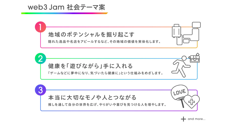 健康を追い求めるあまり、生活がストイックになり過ぎることも。でも、「夢中でゲームをしていたら健康になっていた」なんて仕組みも作れるはず。各企業のアセットや知見をweb3 Jamに持ち寄ることで、楽しい健康をめざします。