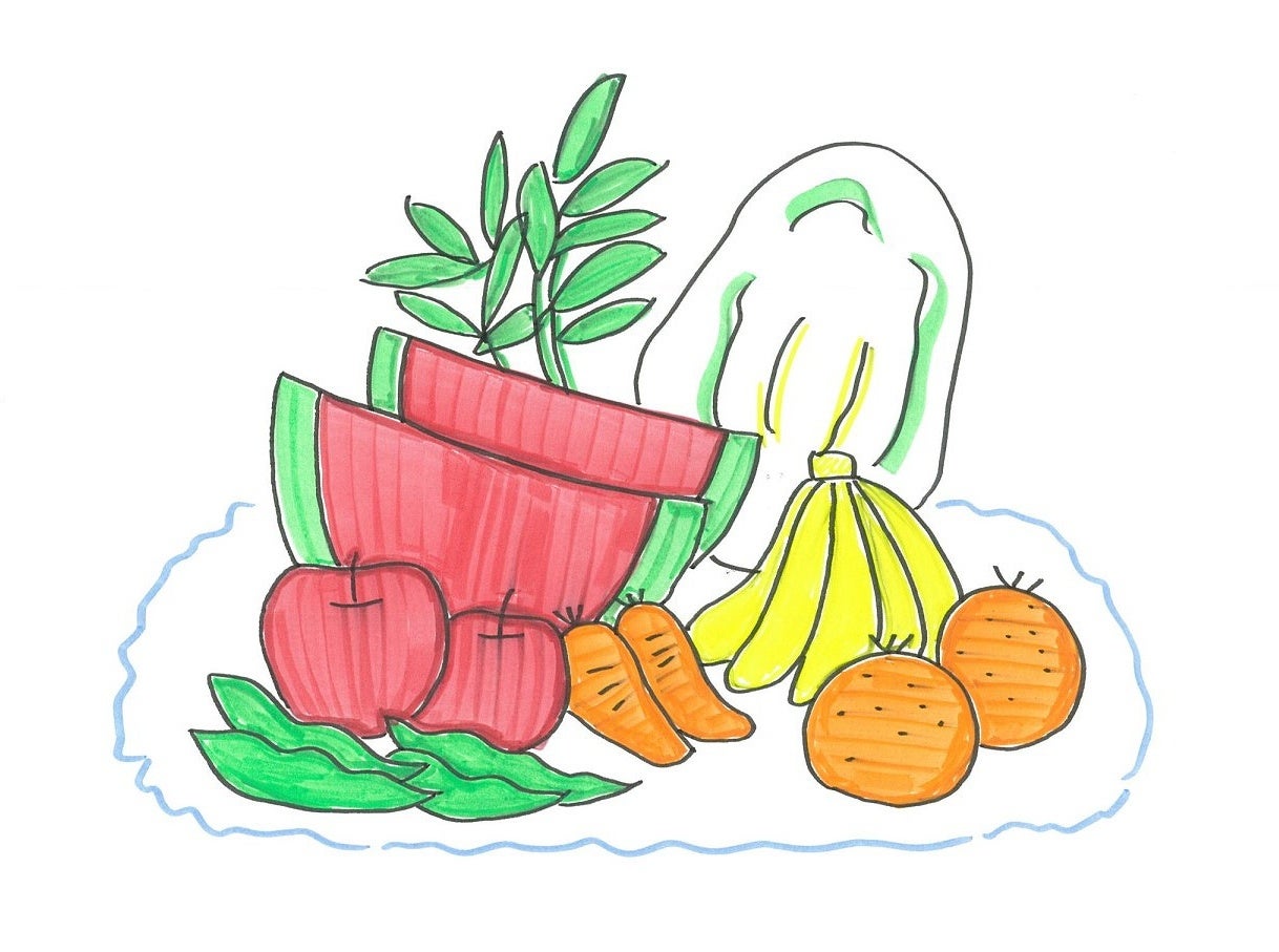 スイカ、バナナ、ミカン、リンゴ、ニンジン、ハクサイ、クウシンサイ、エダマメ、桃をプレゼントします。