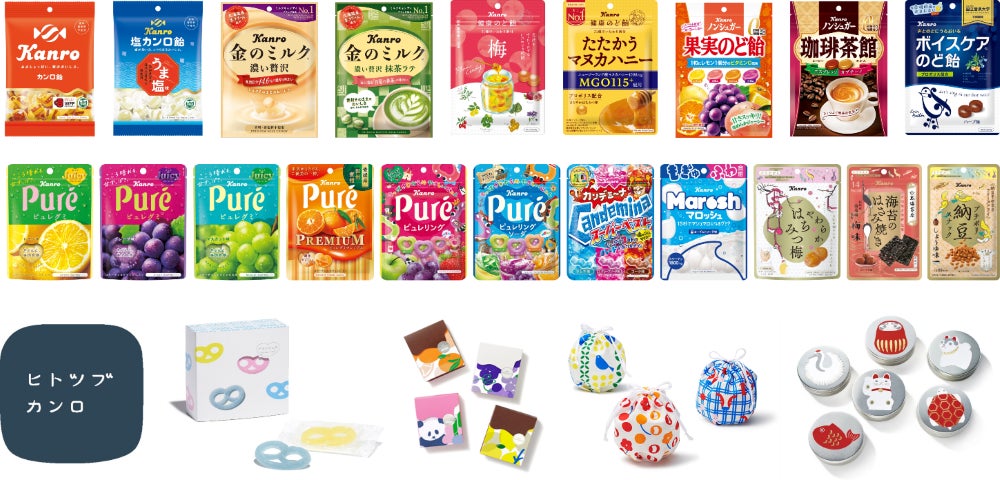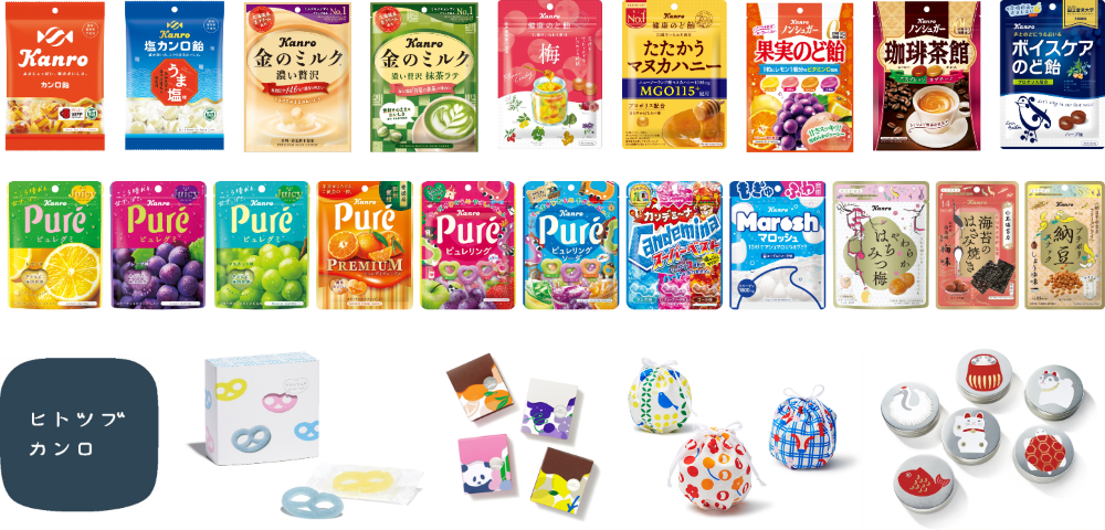 当社は1912年の創業以来、社名になっている「カンロ飴」を始め、菓子食品業界で初ののど飴となる「健康のど飴」、ミルクフレーバーキャンディ市場売上No.1ブランド※1「金のミルク」、大人向けグミの先駆けでありグミの売上トップブランド※2である「ピュレグミ」など、生活者の皆さまから愛される商品を創り続け、成長してまいりました。直営店「ヒトツブカンロ」では、「ヒトからヒトへ つながる ヒトツブ」をコンセプトにキャンディの魅力を発信しております。