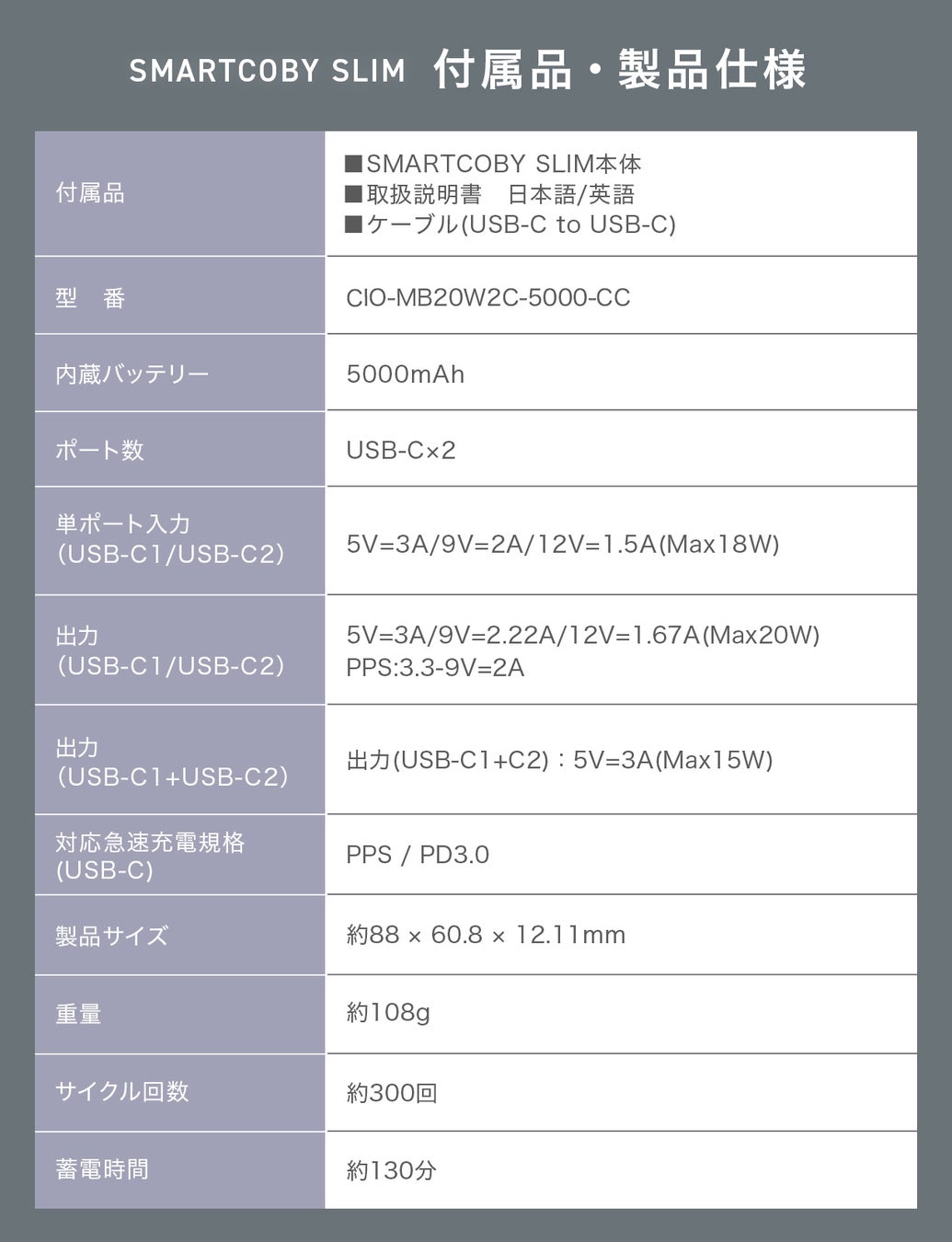 SMARTCOBY SLIMに採用した容量5,000mAhは、iPhoneやGalaxyなど、人気のスマートフォンのバッテリー容量とほぼ同じ。